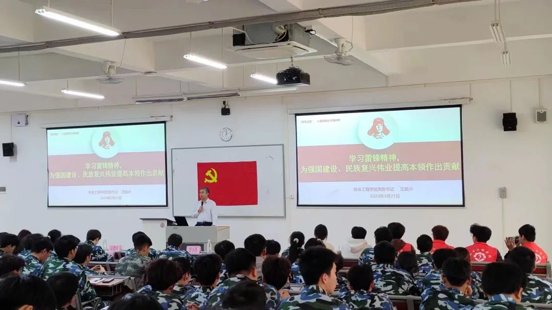 机电工程学院党委书记江能兴为入党积极分子培训班学员讲授第一课《学习雷锋精神,为强国建设、民族复兴伟业提高本领作出贡献》。江能兴号召广大青年学生学习雷锋精神,让雷锋精神在新时代绽放更加璀璨的光芒,为全面建设社会主义现代化国家、全面推进中华民族伟大复兴凝聚强大力量。