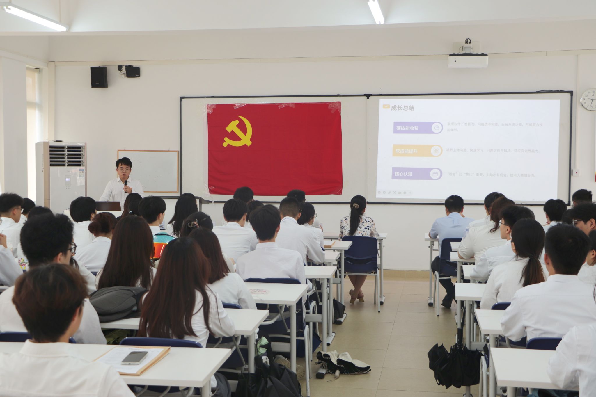 为发挥优秀党员的“头雁”效应,会议邀请了优秀毕业生党员代表陈豪、蔡瑾作交流发言,他们分别围绕升本复习备考、高质量求职就业等方面进行了经验分享,通过生动的实例与深刻的感悟,展现出了党员的责任与担当,充分彰显了信息党员的先锋模范作用。