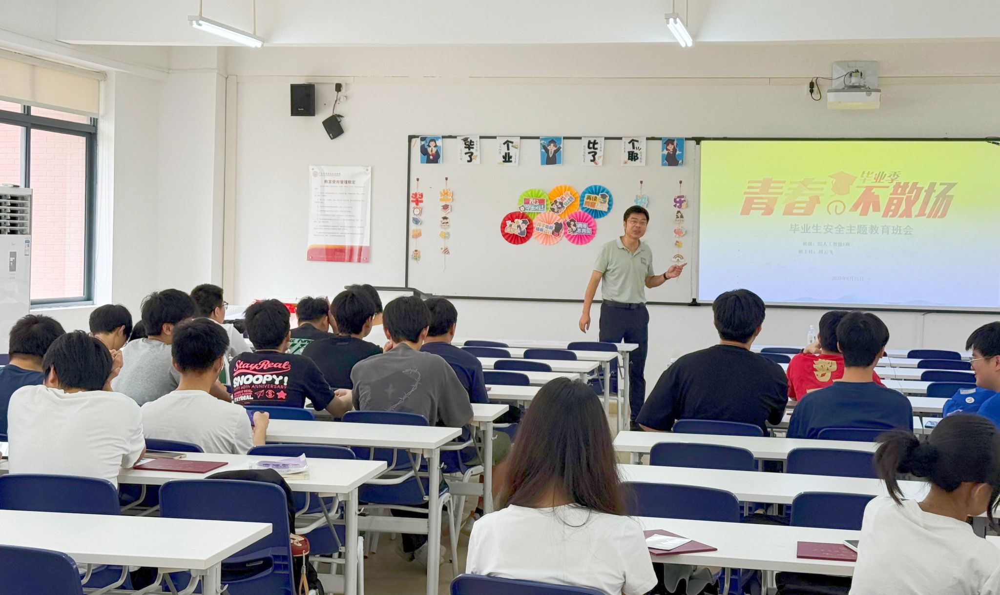 信息学院通过开好“最后一课”毕业主题班会,强化育人成效。大屏幕上滚动播放着珍贵的照片与视频,往昔校园生活的点点滴滴如电影般浮现,瞬间勾起了师生们无数美好的回忆。大家一同回望青春岁月,感恩这场美好的相遇,也带着憧憬准备扬帆起航。班主任以“感恩与成长”为主线,引导同学们珍惜同窗情谊,铭记师长教诲,感恩父母付出,厚植母校情怀;同时结合社会现实,分享职场心理调适技巧,助力毕业生快速适应角色转变。针对学业困难、就业迷茫等特殊群体学生开展深度谈话,联动家长共同制定帮扶计划,确保成长路上“一个都不掉队”。班会尾声,毕业生们在签名墙上挥笔留下青春印记,或写下热血誓言,或绘就未来蓝图,在互道珍重中,为大学时光镌刻下温暖而庄重的句点。