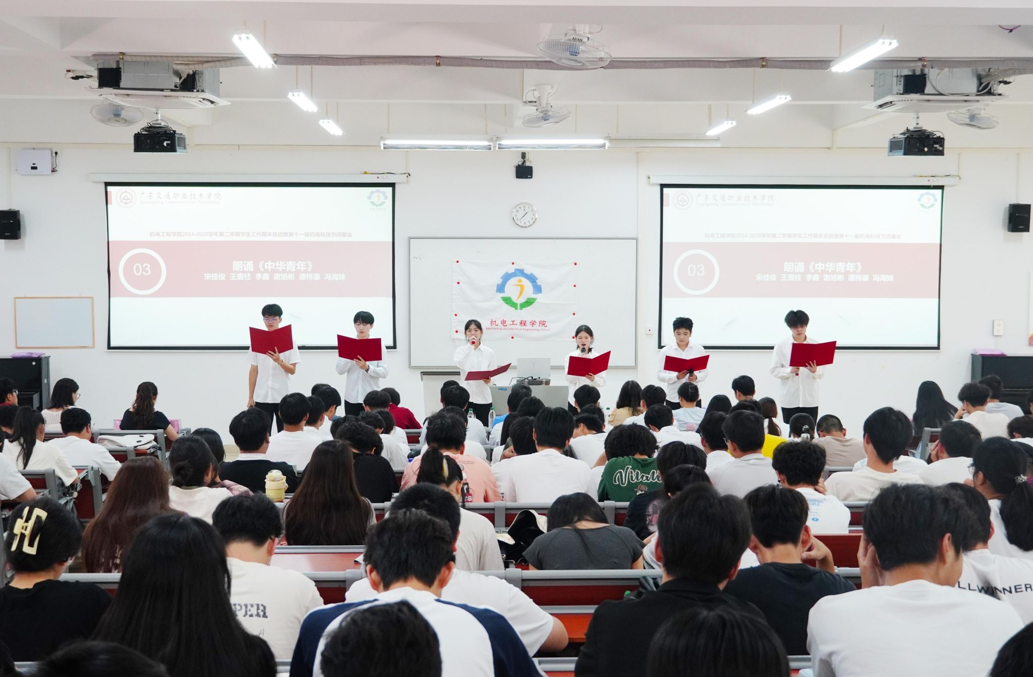宋佳俊等六位青年学子以朗诵《中华青年》抒发爱国情怀与青春担当,铿锵有力的词句展现了机电学子矢志报国的坚定信念。学院“百千万工程”突击队学生代表曾思晴结合2025年广东大中专学生志愿者暑期文化科技卫生“三下乡”社会实践活动暨广东青年大学生“百千万工程”突击队行动,进行了经验分享,为同学们投身基层、服务社会做好准备。