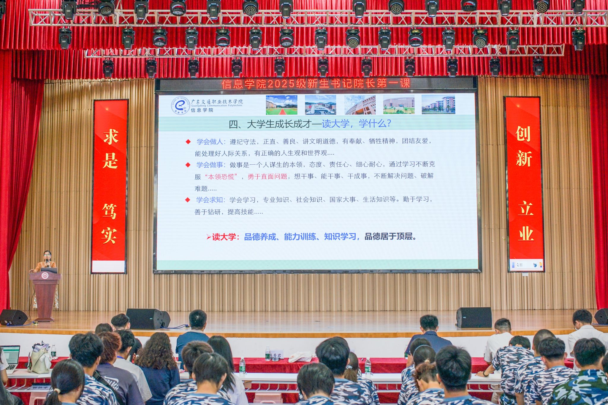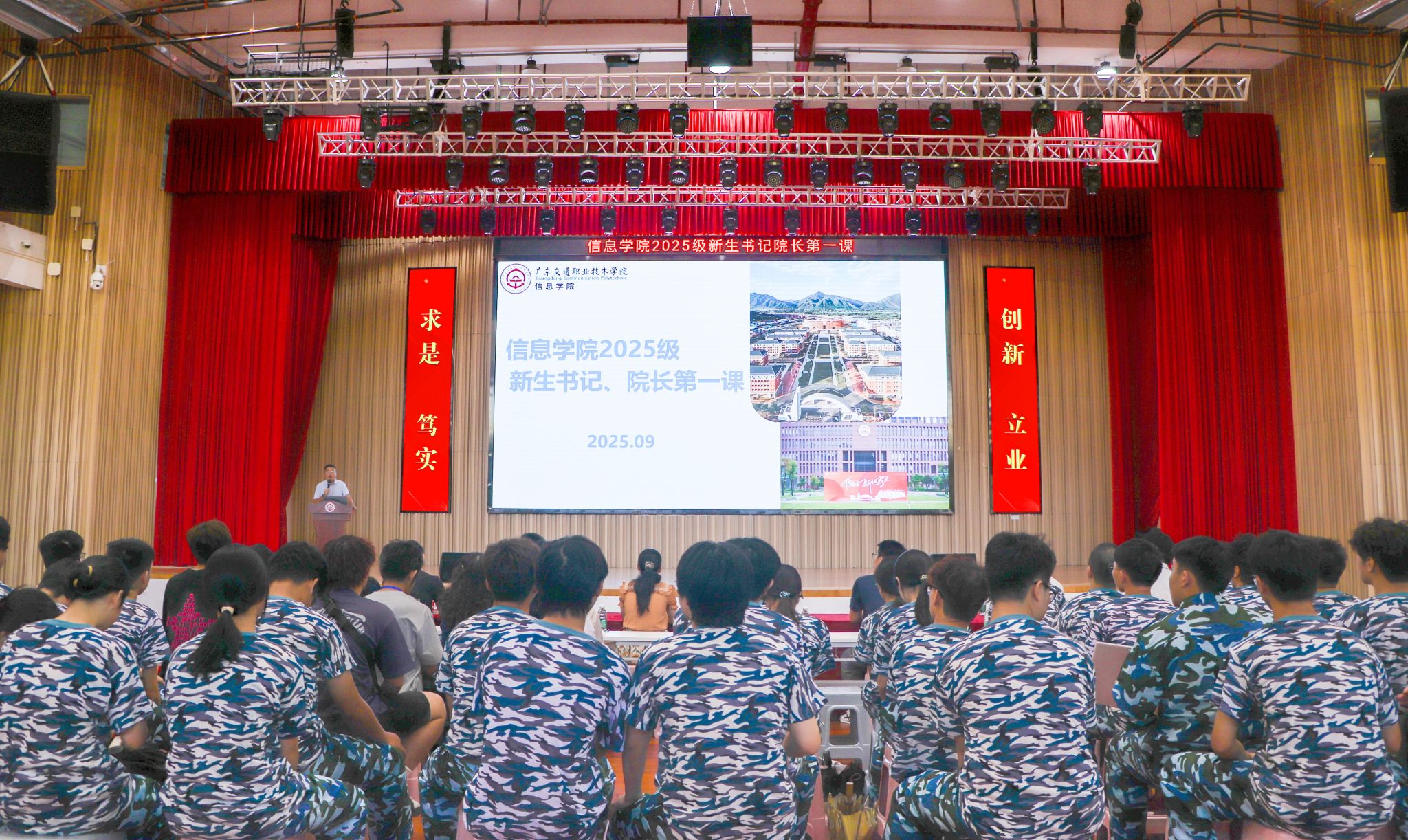 为充分展现思政育人功能,切实落实立德树人根本任务,引领2025级新生构筑崇高理想、奠定坚实的信念基础,帮助新生尽快适应大学生活与学习环境,9月17日上午,信息学院在清远校区多功能厅举行2025级新生书记、院长第一课。信息学院党委书记陈秀君、副书记陈振宇,副院长许兴鹍以及全体辅导员、新生班主任、助班心辅、2025级全体新生参加第一课。会议由陈振宇主持。