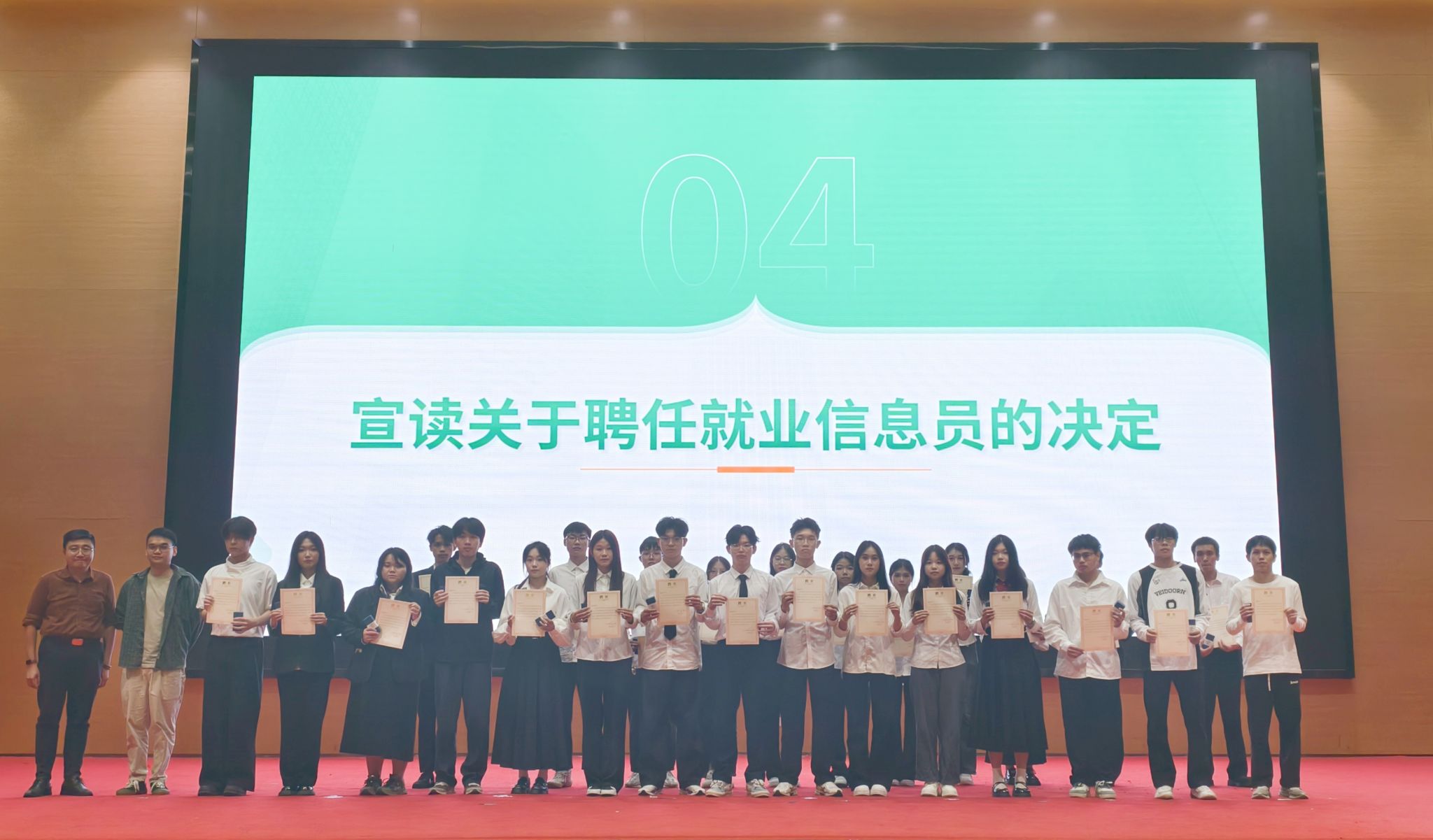 为强化就业信息传递,会议现场举行2026届就业信息员聘任仪式。陈秀君宣读《关于聘任信息学院2026届毕业生就业信息员的决定》,要求各位就业信息员主动与学院负责就业工作的老师、班级学生多交流,了解学生所关心的就业事项,及时向班主任、辅导员反馈,帮助同学解决相关困难,真正做到“就业信息传递不丢失,服务工作到位暖人心”。