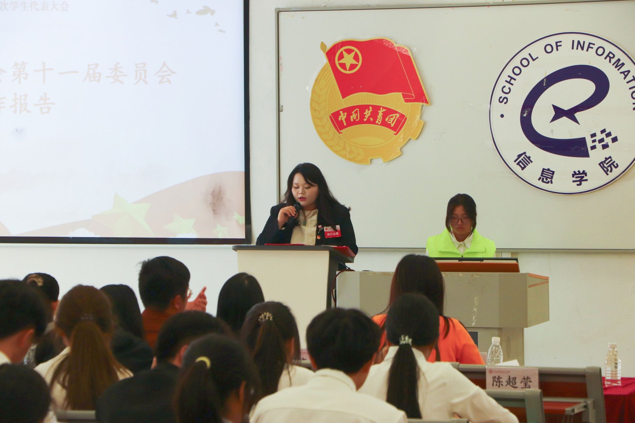 为深入学习贯彻党的二十大精神,扎实推进学生组织规范化建设,引领青年学子在新时代勇担使命,11月6日,信息学院在笃实楼101课室召开了第十二次学生代表大会。信息学院党委书记陈秀君、党委副书记陈振宇,团委书记王杰,全体辅导员、学生会主席团成员及学生代表,校学生会及兄弟学院学生会成员出席了会议。