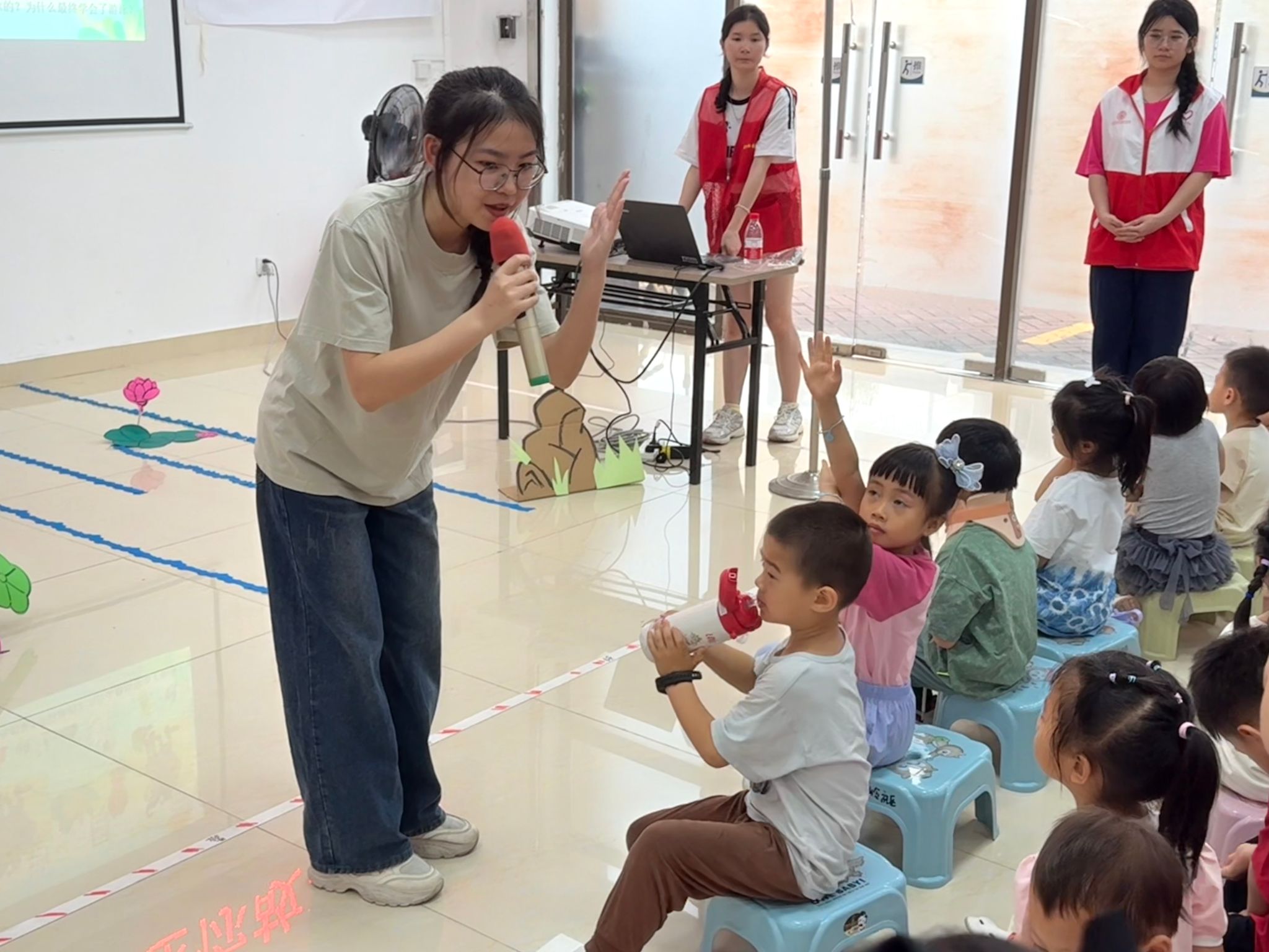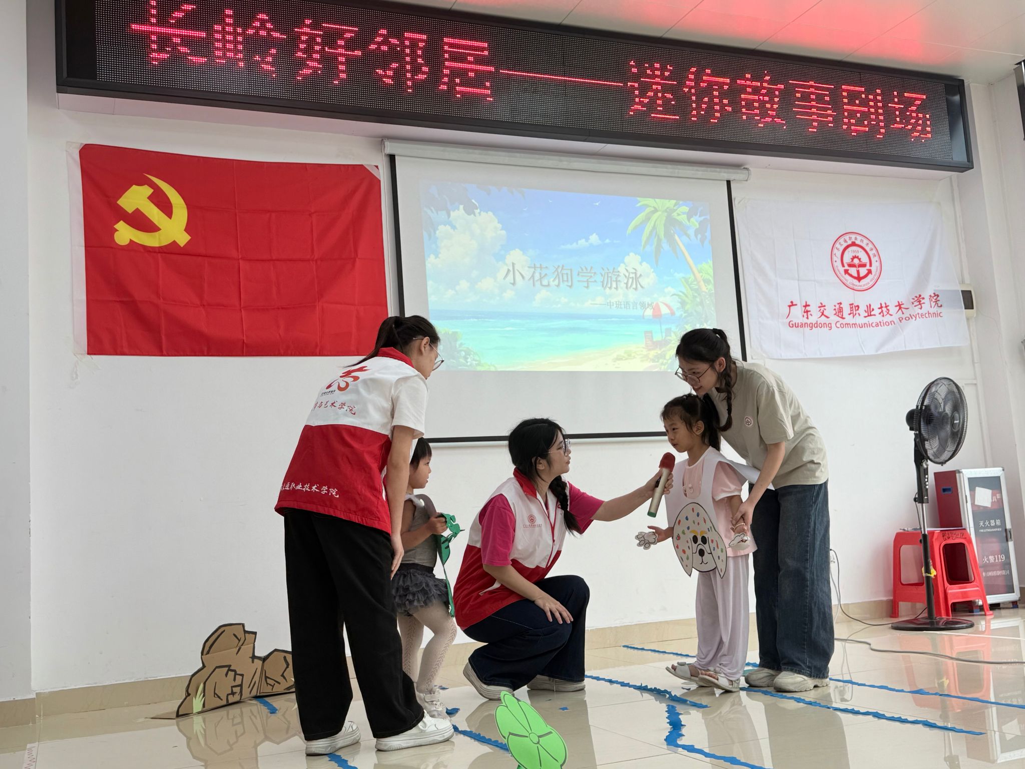 活动现场,学生们充分发挥学前教育专业特长,通过角色扮演、情景互动、手工制作等多种形式,生动演绎了《小花狗学游泳》经典绘本故事。孩子们在沉浸式体验中感受阅读乐趣,现场洋溢着欢声笑语。