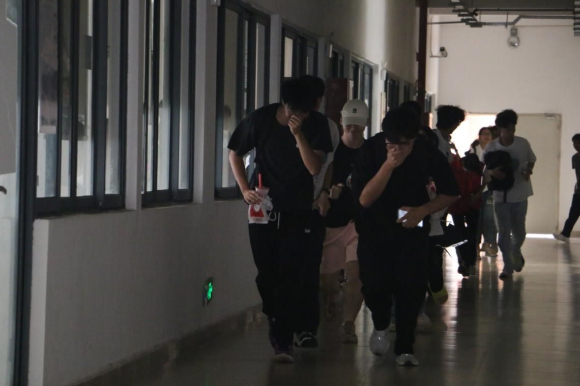 本次疏散演习模拟了在融创楼B-208教室上课期间突发火灾的情景,展示了学生志愿消防队员与学院保安队协同作战、发出警报、组织疏散、执行灭火以及进行紧急处置的过程。当火灾警报声响起,学生志愿消防队员迅速依照火灾应急预案行动,有序地组织人员疏散撤离,并及时联系学院保安队请求支援。保安队在接到通知后,迅速响应、紧急出动,执行灭火和疏散人员的任务。在工作人员的精准指挥下,上课的师生得以安全撤离,实训楼火灾被及时扑灭,未造成严重损失。