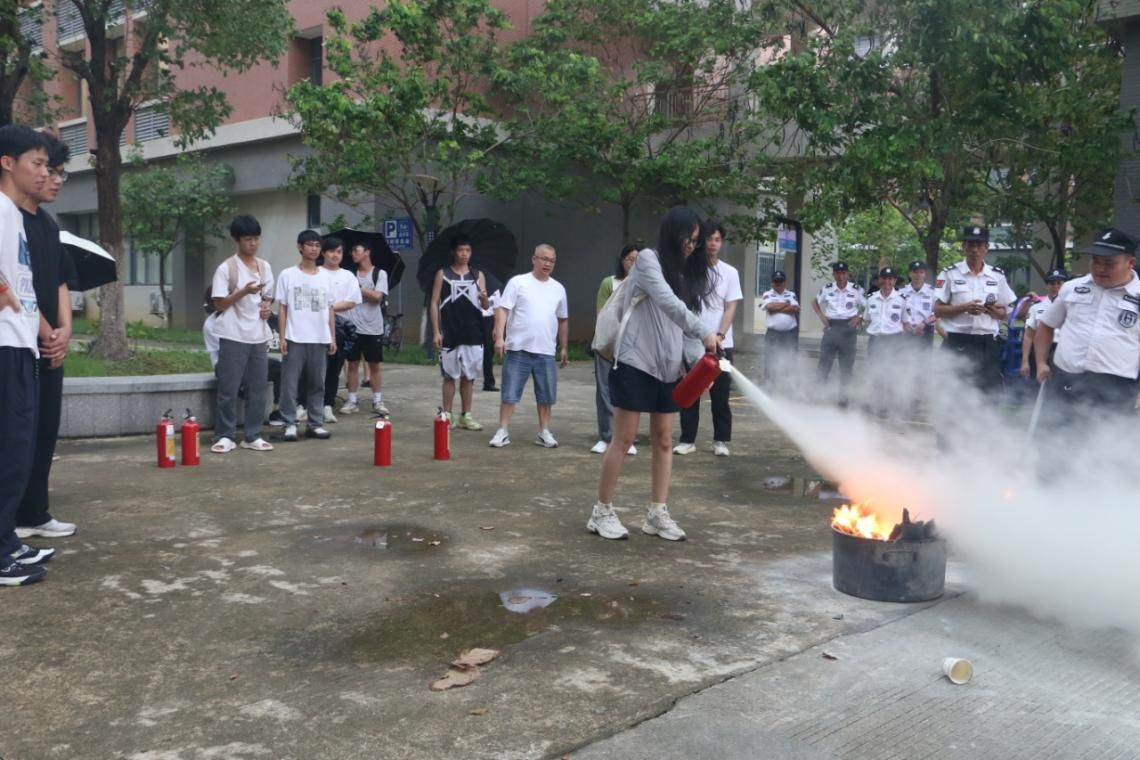 学院保卫队刘志彬向在场师生分享了干粉灭火器的正确使用技巧,进行了现场灭火演示,并强调遭遇火情时要保持冷静镇定。现场的学生代表在工作人员的指导下使用手提式灭火器,进行了灭火操作练习。