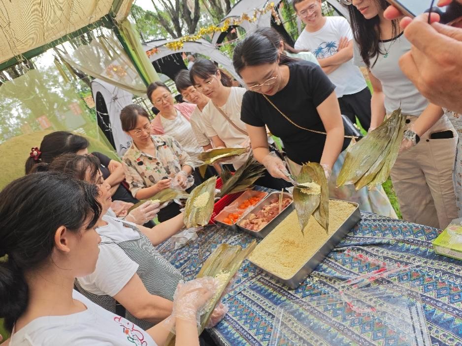 午餐后,进入最具端午特色的环节——包粽子。工会精心准备了糯米、粽叶、五花肉、咸蛋黄等广式粽料,教职工们分组协作,从折粽叶、填馅料,到捆扎成型,一步步体验传统手艺的魅力。现场粽香四溢,欢声笑语不断,大家在动手实践中感受传统文化的深厚底蕴。