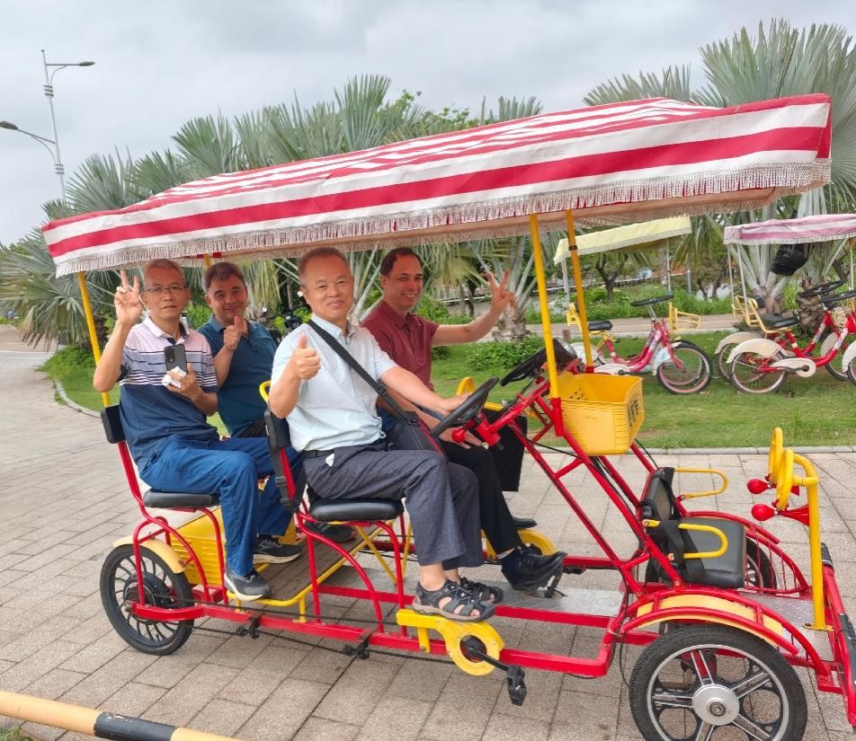 作为广州新城的生态明珠,海鸥岛以其13公里的环岛公路和迷人的田园风光成为本次活动的理想场所。教职工们自由组队,选择山地车、双人车或四人车,沿着绿树成荫的环岛公路骑行,感受海风拂面的惬意。沿途的沙滩、农田和渔村风光让大家暂时忘却了工作的繁忙,沉浸在大自然的宁静与美好之中。