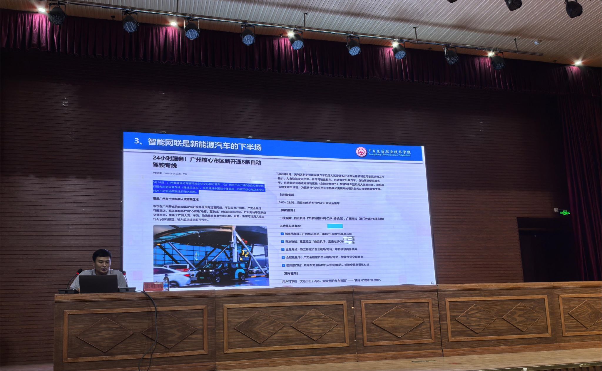 智能网联是新能源汽车的下半场,在国家相关政策的大力支持下,智能网联汽车产业加速发展。讲座也向与会师生介绍了智能网联汽车的基本概念、智能网联汽车的关键技术、中国智能网联汽车的创新等内容。中国汽车工业协会发布的数据显示,汽车产业加快转型,2024年我国汽车产销双超3100万辆,其中新能源汽车产销均超1280万辆,占汽车新车总销量的40.9%,连续10年位居世界首位。2025年一季度新能源汽车产销分别增长50.4%和47.1%。新能源汽车行业的快速发展,将持续需要大量的高素质技能人才。