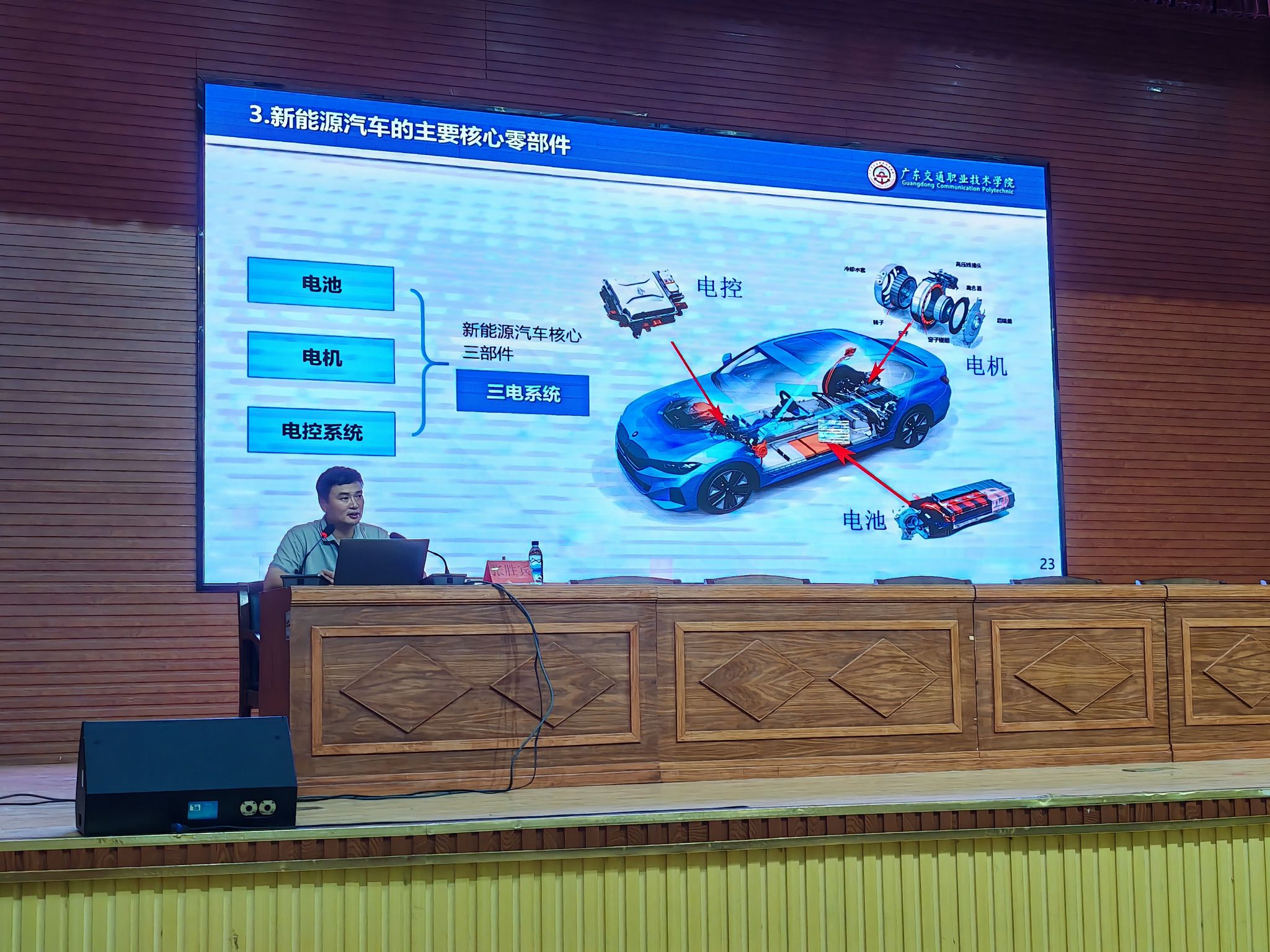 本次专题讲座围绕汽车技术发展前沿和人才培养企业需求变化这一主题,向与会师生详细介绍了当前新能源汽车行业发展现状、新能源汽车与中国制造的崛起、新能源汽车的发展历程与分类、新能源汽车的主要核心零部件等内容。