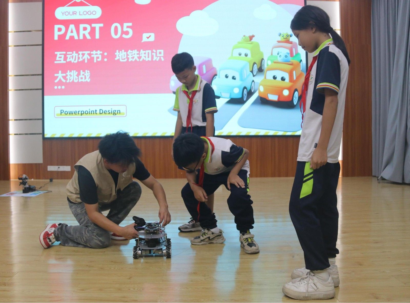为深入贯彻《广东省推动基础教育高质量发展行动方案》《广东省“百县千镇万村高质量发展工程”教育行动(2023-2027)》等文件精神,轨道交通学院积极行动,响应学院“双百行动”合作共建和“清新区基础教育帮扶”工作号召,充分发挥自身专业优势,助力清新区基础教育发展。6月12日,轨道交通科普基地团队一行10人前往清远市清新区第七小学,利用课外科创作品等向第七小学四年级的同学们开展了一场别开生面的轨道交通科普活动,为孩子们打开一扇通往轨道交通世界的大门,激发他们对科学探索的兴趣与热情。