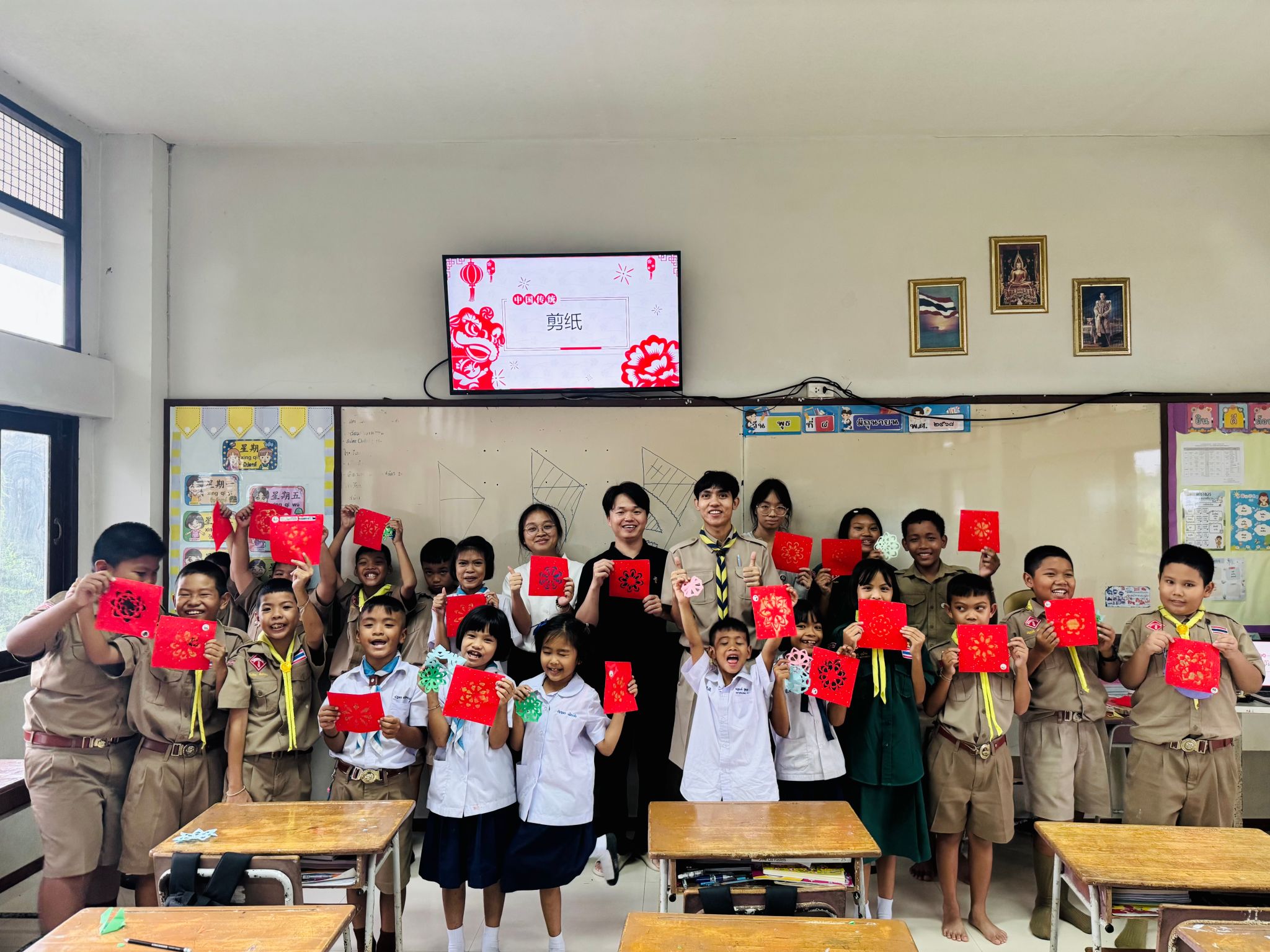依托学院“中文+中华才艺技能”项目,师生团队开展一系列文化实践活动:剪纸课上,泰国学生剪出吉祥团花;拓印与水墨吹画课堂展现汉字与东方美学魅力;京剧脸谱绘制中,生旦净末丑的故事引发热烈讨论;中国结制作传递“以结寄情”的祝福。师生还策划了“画粽子”“制扇面”等主题活动,暖武里府学生用五彩画笔描绘粽子表情,尖竹汶府课堂通过视频与手工体验让端午文化“活起来”。同时,团队参与泰国拜师节跪拜礼、寺庙文化体验等活动,丰富中泰文化交流。