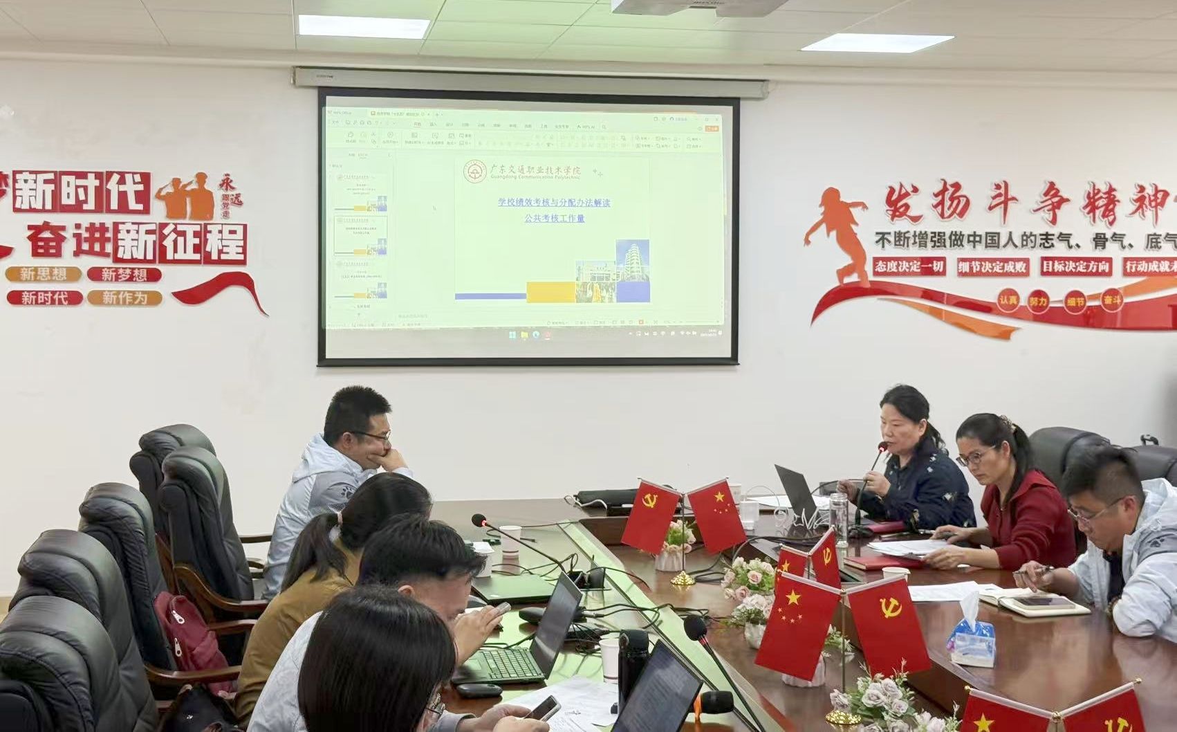 余明艳就新修订的《绩效考核与分配办法》开展修订条款解读及宣贯,对《信息学院公共服务工作量管理实施细则(征求意见稿)》进行逐条阐释。她详细说明两份文件的制定背景、核心条款与执行标准,重点解答了老师们普遍关注的“公共服务工作量核算范围”“绩效考核指标权重”等问题。全体教职工就文件细则畅所欲言,通过充分听取意见、凝聚共识,为后续文件的完善优化与落地执行奠定民主基础。