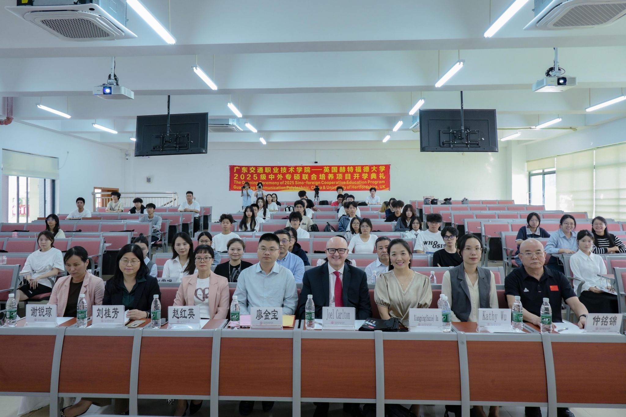 11月10日,运输与经济管理学院2025级国际经济与贸易、跨境电子商务两个专业中外专硕联合培养项目开学典礼在清远校区厚德楼103教室举行。学院党委副书记廖金宝、国际交流合作项目负责人刘桂芳、运输与经济管理学院副院长赵红英、赫特福德大学商学院副院长Joel Carlton、研究生课程主任Xiangping (Suzie) Du、国际办公室中国地区负责人Kathy Wu、专硕项目负责人李铭,与广东教育国际交流协会副会长仲铭锦、广东人力资源研究会国际人才交流专业委员会副秘书长彭雯珮等嘉宾及全体师生齐聚一堂,共同见证这一国际化教育合作的重要时刻。