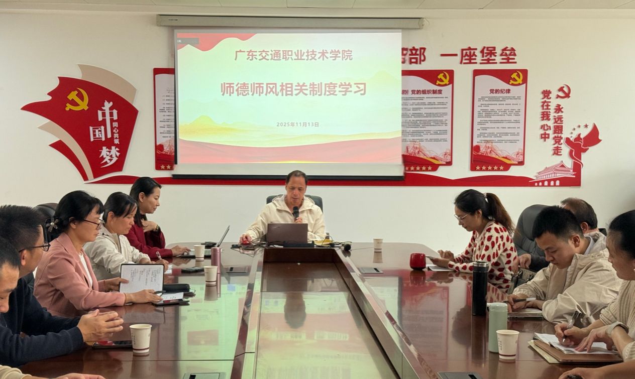 本次会议专题学习学院近期印发的师德师风系列制度文件。伍雄晖重点解读了《广东交通职业技术学院教师职业行为细则(试行)》《师德师风负面清单及违规行为处理办法(试行)》等文件内容,详细阐述了坚定政治方向、自觉爱国守法、潜心教书育人等十项教师职业行为准则的具体要求。通过对师德评价考核规范与违规处理红线的深入讲解,全体教师对师德师风建设要求有了更全面的认识。