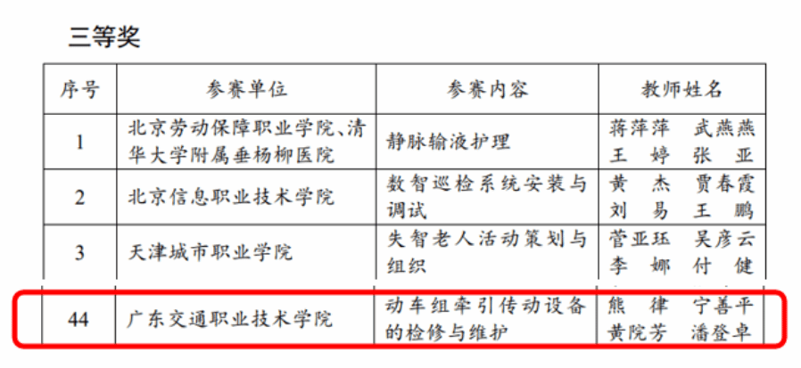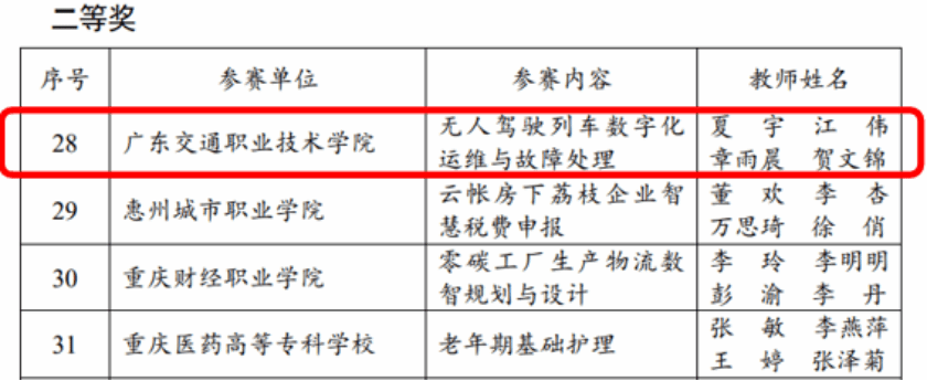 11月25日,2023年全国职业院校技能大赛教学能力比赛落下帷幕。根据职业院校技能大赛官网于12月4日发布的《关于对2023年全国职业院校技能大赛教学能力比赛拟获奖项目名单进行公示的通知》(赛执委函〔2023〕35号),我院夏宇等教学团队(参赛作品“无人驾驶列车数字化运维与故障处理”)、熊律等教学团队(参赛作品“动车组牵引传动设备的检修与维护”),与全国784所院校的908支教学团队同台竞技,获高职专业课程一组二等奖和三等奖各1项,同时在省赛阶段,获省赛11项(一等奖3项,二等奖2项,三等奖6项)。2023年我院在全国职业院校技能大赛教学能力大赛中取得了历史性突破。
