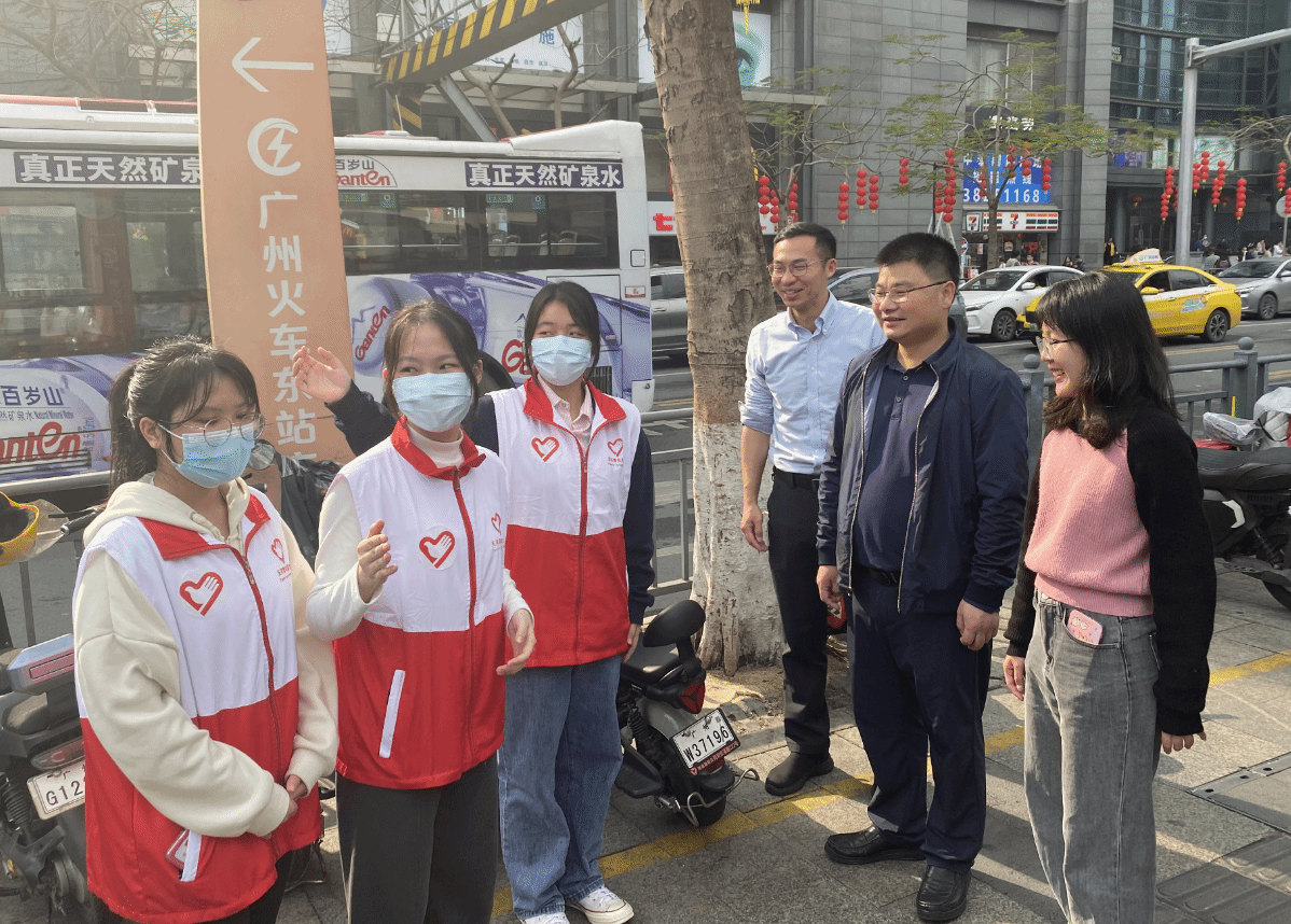 走访察看志愿者岗位期间,唐力代表团天河区委对我院高度重视和支持本次春运志愿服务组织表示感谢,充分肯定了我院大学生志愿者的工作热情与工作成效,表示将进一步深化合作,不断推进天河志愿服务事业高质量发展。廖金宝一行沿着旅客进出站线路与在岗志愿者们进行交流,了解志愿者们的工作时间、每日通勤、岗位职责、服务要求、应急措施、生活保障等方面情况,勉励志愿者们不忘初心、坚持不懈,展现广交青年的良好精神风貌。
