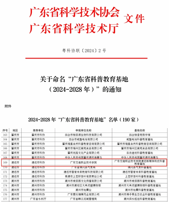 近日,广东省科学技术协会、广东省科学技术厅联合发布了《关于命名“广东省科普教育基地(2024-2028年)”的通知》(粤科协联〔2024〕2号)。经清远市科协推荐,省科协、省科技厅组织专家评审并公示,广东交通职业技术学院清远新媒体助农科普教育基地被命名为“广东省科普教育基地”,成为本次清远市唯一命名建设的高校科普基地建设项目。