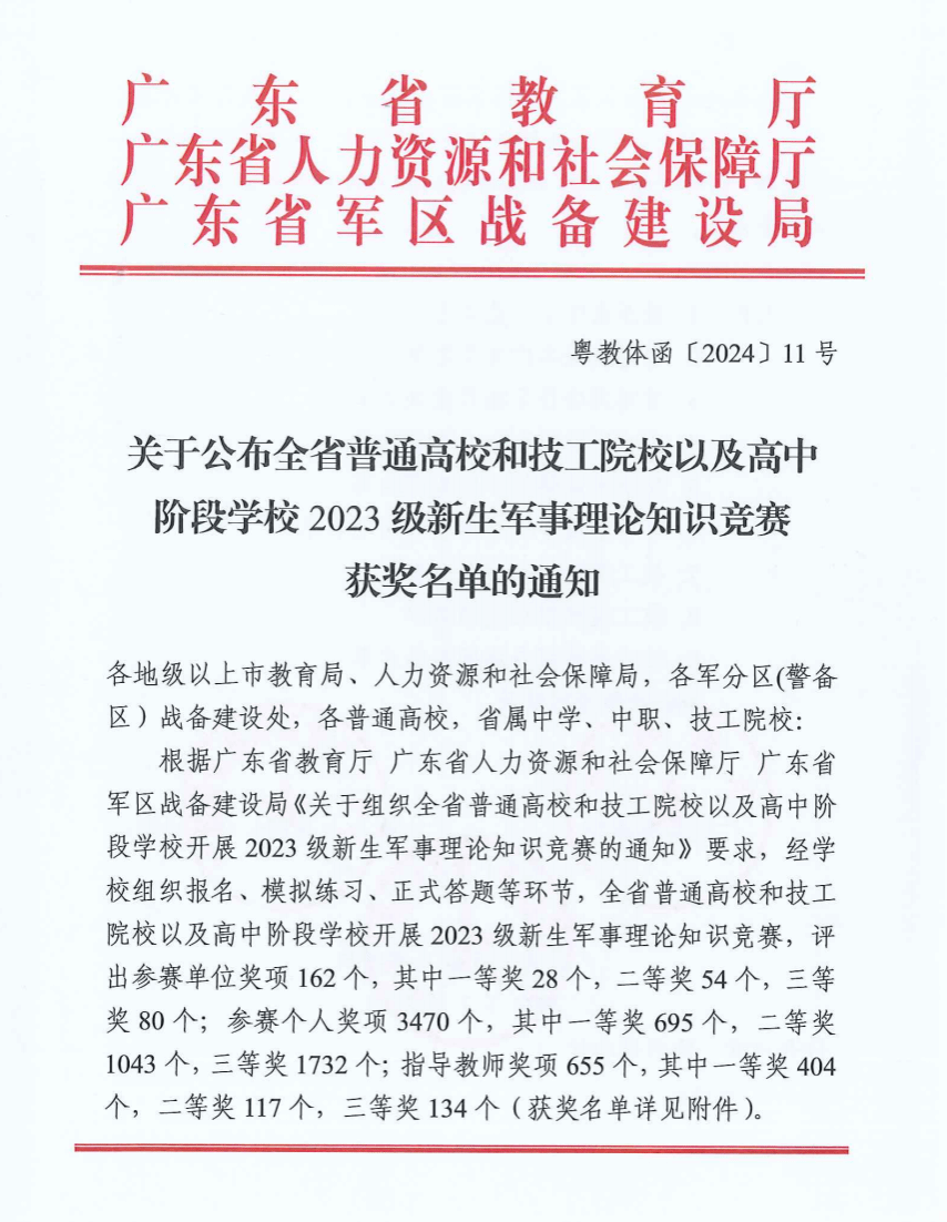 近日,广东省教育厅、广东省人力资源和社会保障厅、广东省军区战备建设局三部门发布《关于公布全省普通高校和技工院校以及高中阶段学校2023级新生军事理论知识竞赛获奖名单的通知》,我院何锦等4名学生荣获一等奖、姚羡雯等8名学生荣获二等奖、黄红艳等34名学生荣获三等奖,学院荣获参赛单位集体一等奖,黄熙芃老师、李贤滨老师荣获指导老师一等奖。