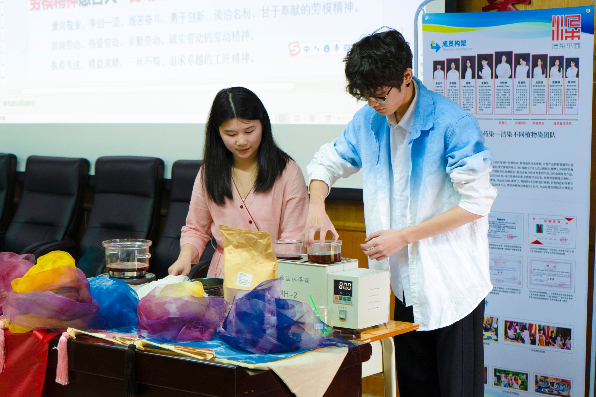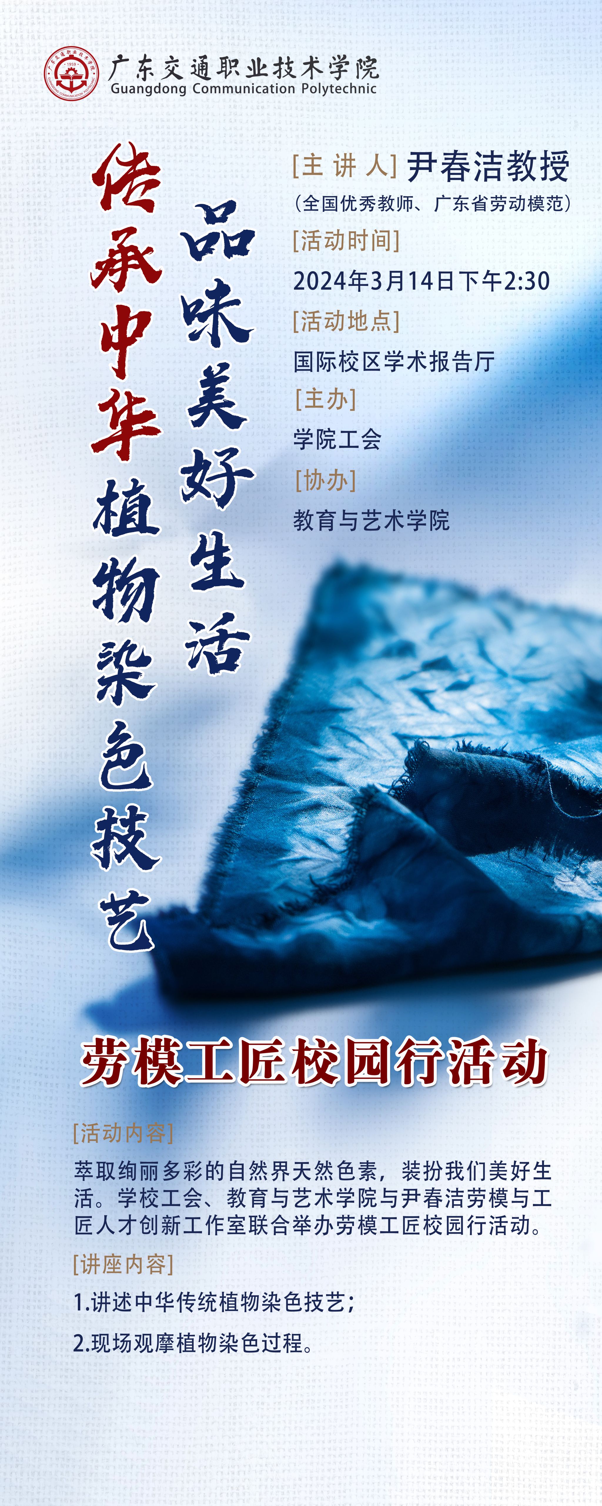 为弘扬劳模精神、劳动精神和工匠精神,传承中华传统植物染色技艺,3月14日下午,学院工会邀请“尹春洁劳模创新工作室”到国际校区开展以“传承中华植物染色技艺,品味美好生活”为主题的劳模工匠进校园活动。学院党委委员、副院长、工会主席熊嘉逸,教育与艺术学院院长罗罕淑、副院长梁准平、姚业华以及120余名师生代表参加了本次活动。