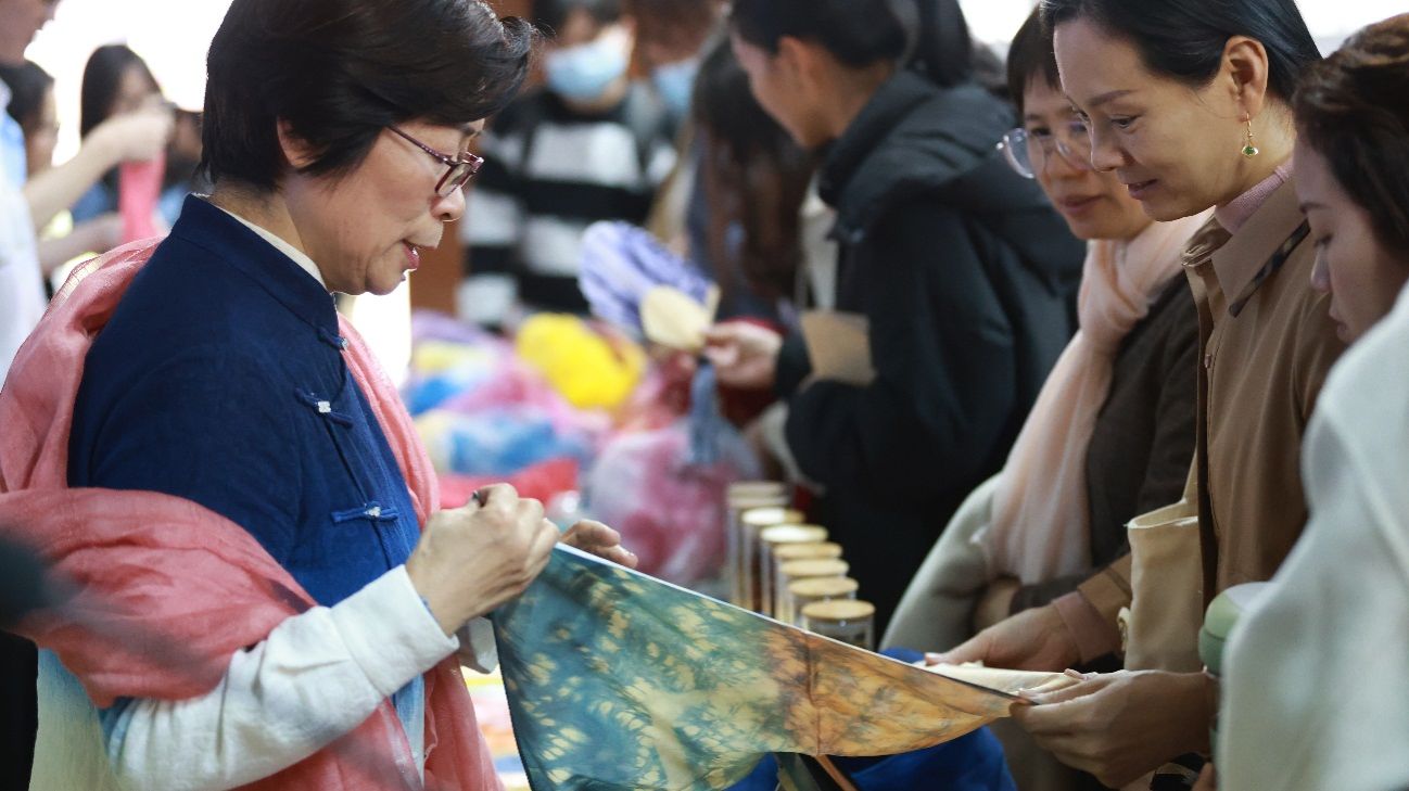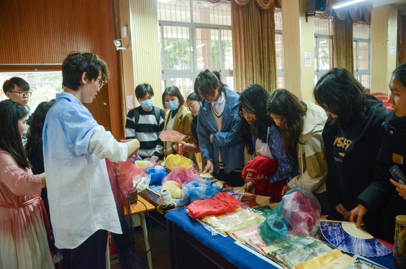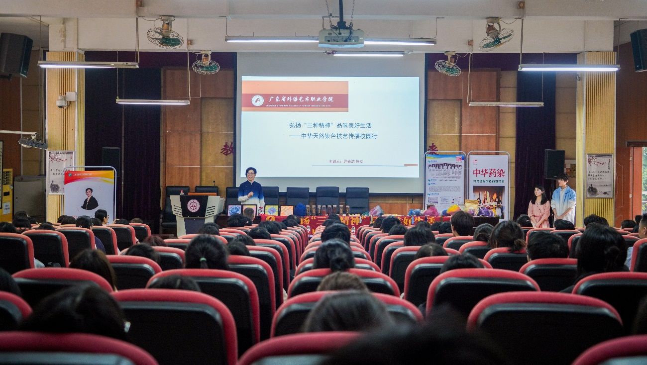 在国际校区学术报告厅,广东省劳动模范尹春洁教授开展了中华传统植物染色技艺专题讲座。尹春洁教授以纪录片和现场实物展示等形式,向师生深入浅出地介绍了植染的独特魅力、染料的丰富种类以及扎染的精湛技法,并通过团队成员的现场演示、师生的近距离观摩体验等环节,使老师同学们亲身感受到了植物染色的神奇与魅力。