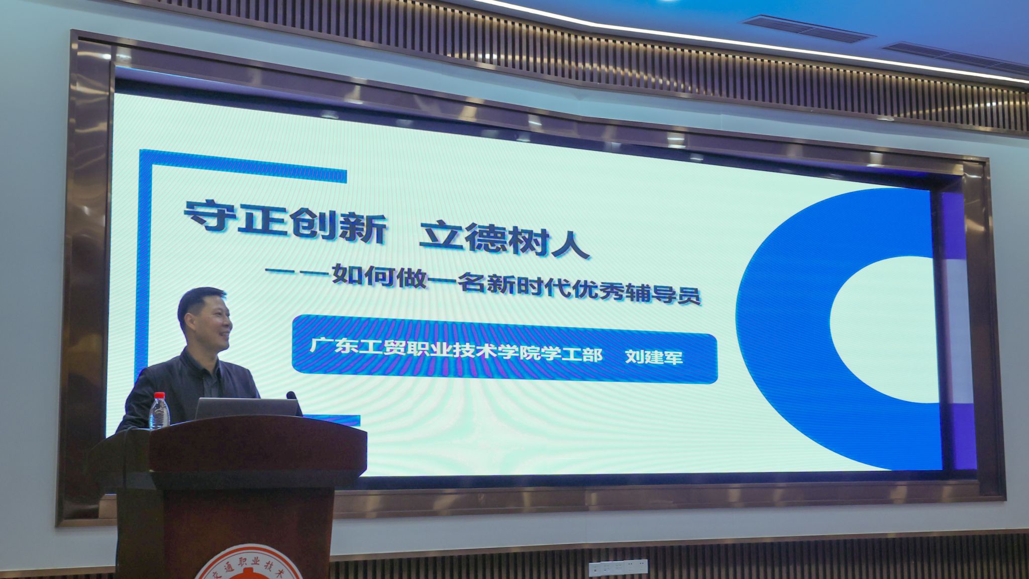 广东工贸职业技术学院学生工作处刘建军处长以《守正创新 立德树人——如何做一名新时代优秀辅导员》为题,用数据说话,阐述了学工人的育人四季,总结出了辅导员工作的时间表,强调辅导员在学生成长成才路上的重要性和在平安校园建设中的重要作用。同时,他从“广东省辅导员年度人物”评选工作出发,指引辅导员们要从大视野、大团队、大载体平台培养方向出发,进一步创新工作方式方法,努力做一名新时代优秀辅导员。