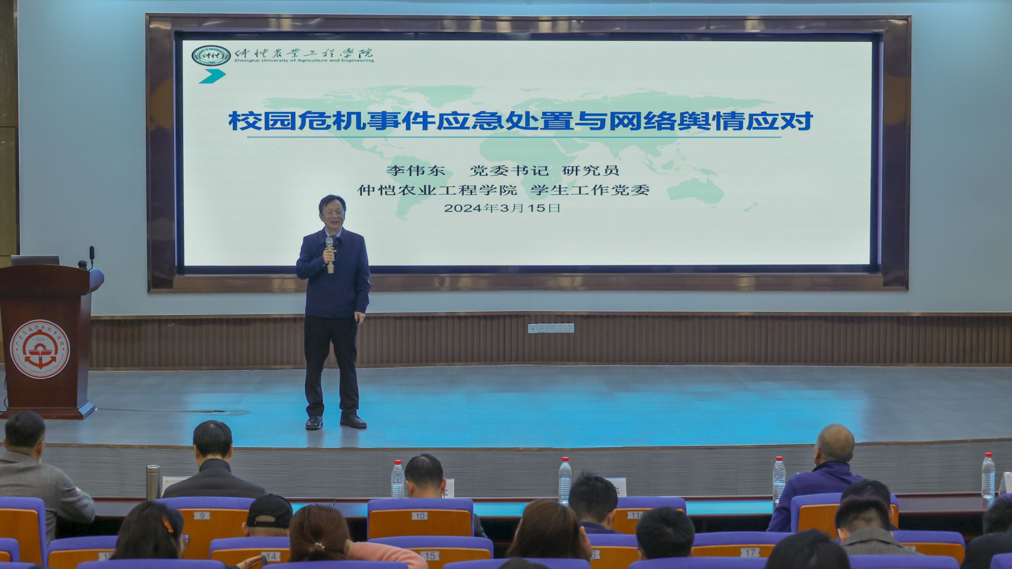 仲恺农业工程学院学生工作党委书记李伟东教授结合高校实际案例,作《学生危机事件应急处置及网络舆情应对》主题报告,从校园危机事件概述、个体危机事件的应急处置、群体性危机事件的应急处置以及校园危机态势下的网络舆情应对等方面分析讲解,指引学工队伍正确理解和面对学生危机事件,正确处置相关工作。