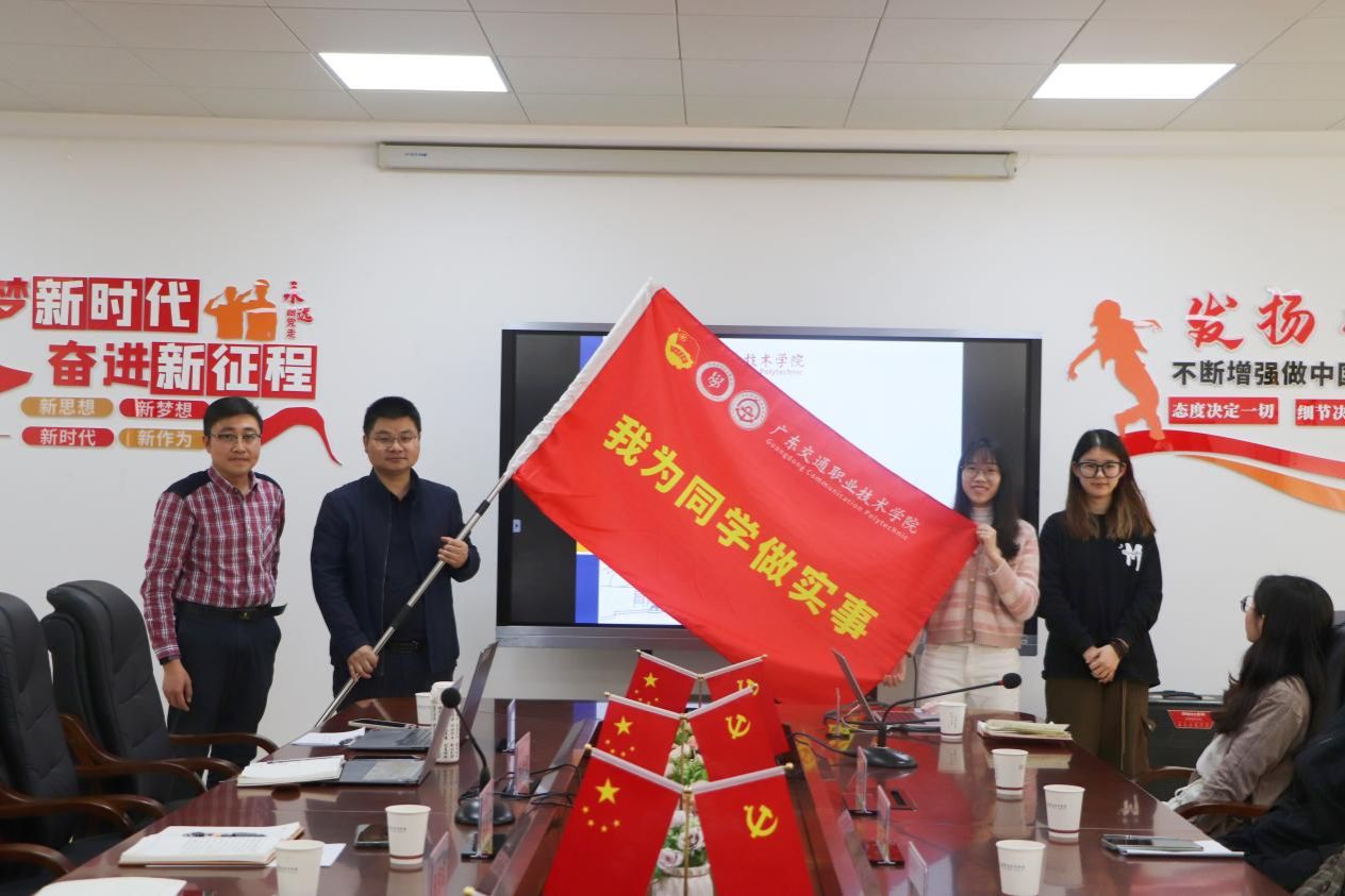 廖金宝在讲话中指出,近年来学院深耕教育教学改革和人才培养,多措并举将学生会建设成为服务广大学生成长成才的平台。本次“芯·青年”成长驿站跻身“我为同学做实事”国赛展示平台,是学院深化共青团改革和学生会改革中的重要标志性成果。他鼓励项目团队成员要轻装上阵、奋勇拼搏、全力以赴、突破自我,在全国性平台展现好广交智慧和广交方案,争取获得更好的成绩。要以本次活动为契机,持续深入探寻学生服务工作中更多的先进案例,并通过比赛、交流活动多种途径展示我院人才培养成效,为助力学院“双高”建设作出更多新的贡献。廖金宝还为本次“我为同学做实事”外出参赛团队授旗。