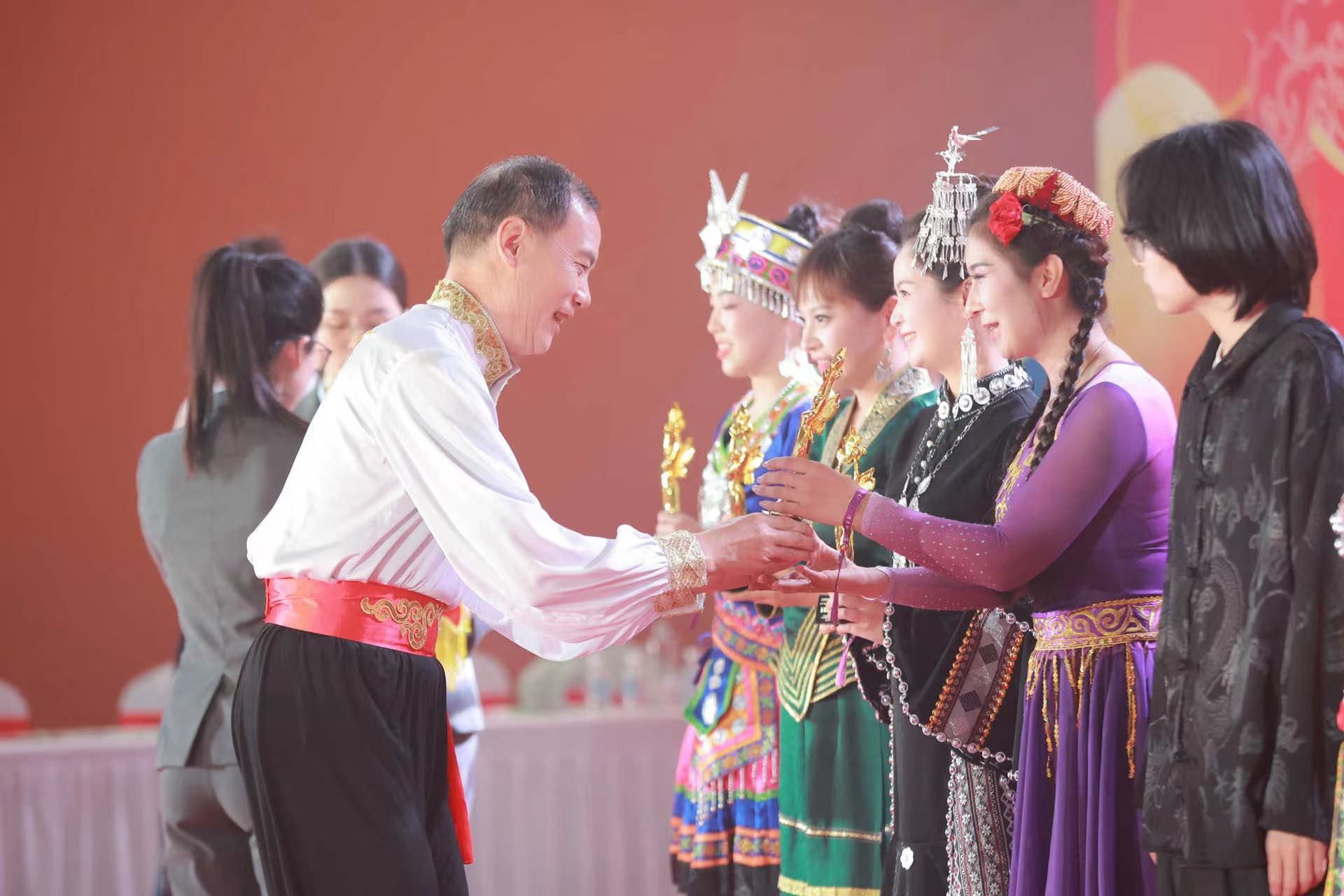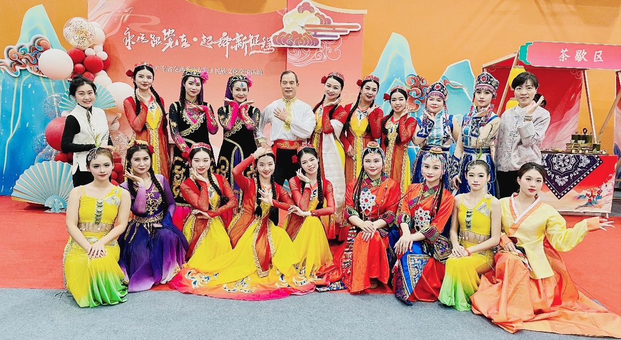 这次活动包括形象快闪、风采展示、民族手工体验等环节,以民族服饰文化为载体,于悠扬的民族音乐中,邂逅民族服饰的华美风采,展示民族舞蹈的热情奔放,体验民族手工艺品的精致灵动,展现中华民族历史文化神韵。我院新疆籍辅导员努扎提阿依.吐尔逊等教职工组织编排的形象快闪节目《晨曦中的玫瑰》以及由教育与艺术学院曾珍珍老师等师生编排展演的节目《最炫民族风》均获得全场好评,学院喜获最炫展演奖和特别贡献奖两个奖项。广东省交通运输厅一级巡视员王富民对学院师生团队的演出高度赞扬并合影留念。