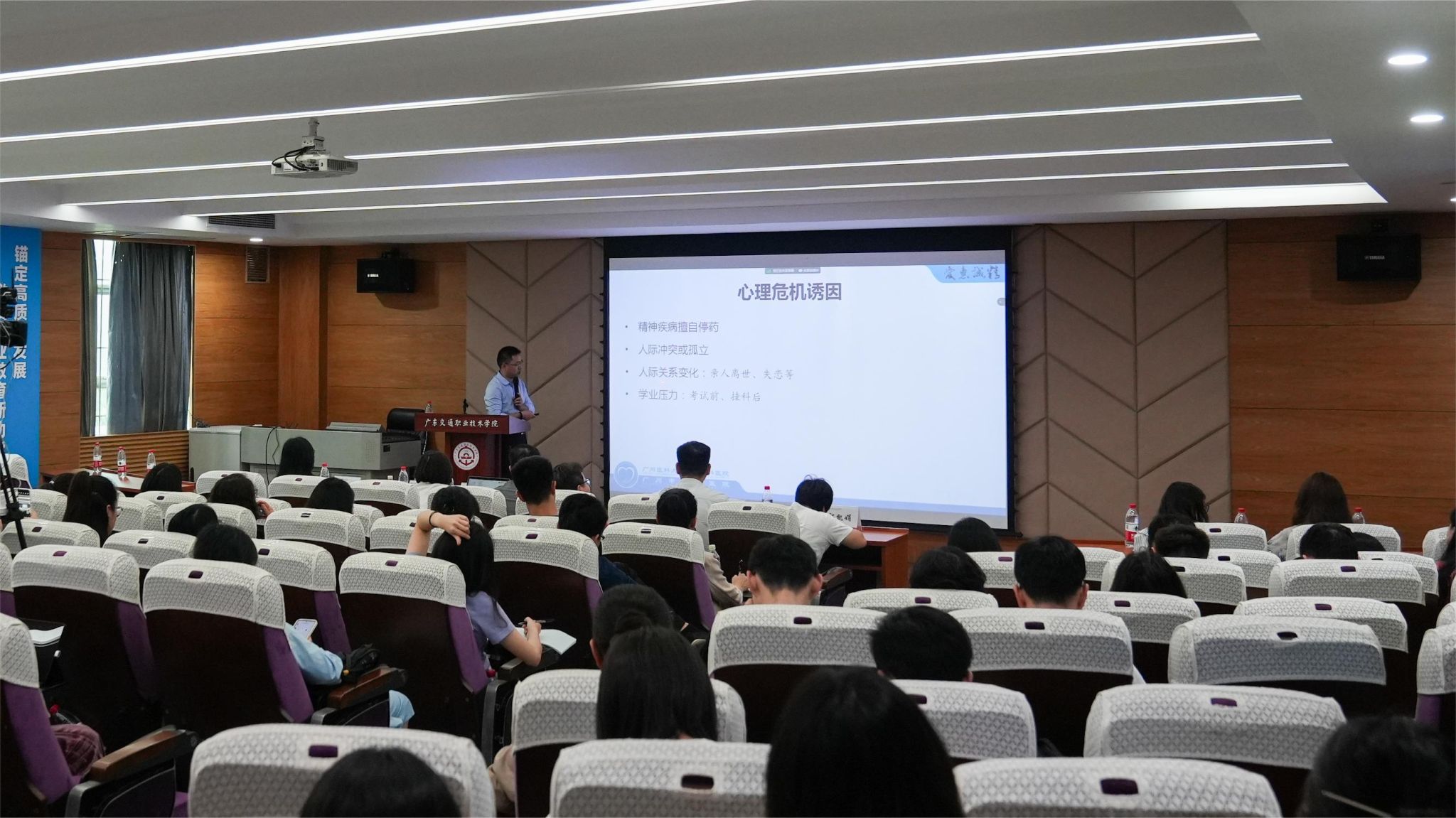 会上,广州医科大学附属脑科医院康复科副主任郭耀光作《大学生常见的情绪情感障碍与心理危机管理》主题讲座。他结合丰富的临床经验和专业知识,深入浅出地分析了大学生常见的情绪情感障碍的成因、识别方法以及干预策略,同时针对心理危机的应对策略及干预原则进行了系统讲解。他强调,应从躯体症状、认知知绪、言语行为和社会功能等多个维度综合评估学生的心理状态,及时发现并妥善处理潜在的心理危机。