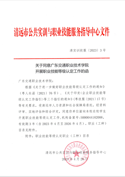 为进一步贯彻落实中共中央办公厅 国务院办公厅印发《关于加强新时代高技能人才队伍建设的意见》,学院以专业为依托,大力拓展各类技能人才评价认定工作,先后成为清远市院校类评价机构,交通运输部交通运输部专业能力评价实施机构,可开展电工、电子商务师、绘图员、公路施工现场管理人员、公路工程测量员、各类船员等职业工种培训及考证。
