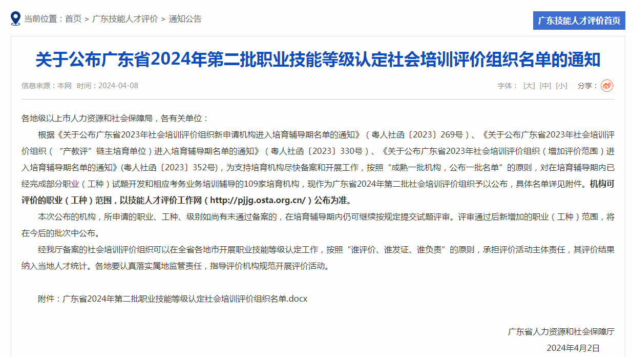 近日,广东省人力资源和社会保障厅公布了广东省2024年第二批职业技能等级认定社会培训评价组织的名单,我院通过社会培训评价组织机构备案,可面向在校生、社会人员开展工程机械维修工、轨道交通信号工、城市轨道交通服务员培训认定。