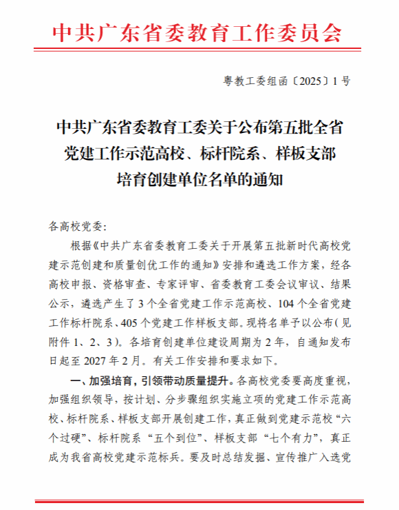 近日,中共广东省委教育工委公布了第五批全省党建工作示范高校、标杆院系、样板支部培育创建单位名单。我院轨道交通学院党委入选第五批“全省党建工作标杆院系”培育创建单位,信息学院学生二党支部入选第五批“全省党建工作样板支部”培育创建单位,学院省级党建“双创”项目再获新突破。