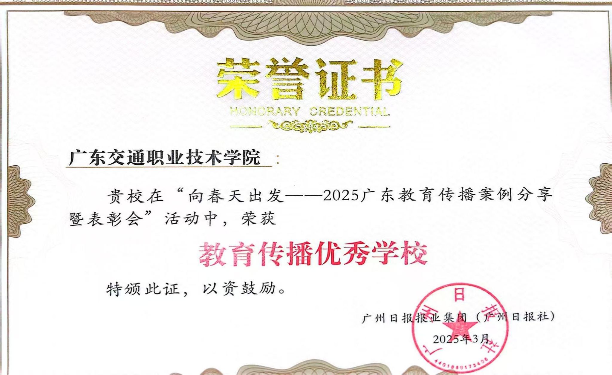3月3日,由广州日报报业集团(广州日报社)联合广州教育学会举办的“向春天出发——2025广东教育传播案例分享暨表彰会”举行,一百多位教育传播人齐聚,实现教育传播“大流量”与“正能量”的双向奔赴。会上,我院获得“教育传播优秀学校”荣誉称号。