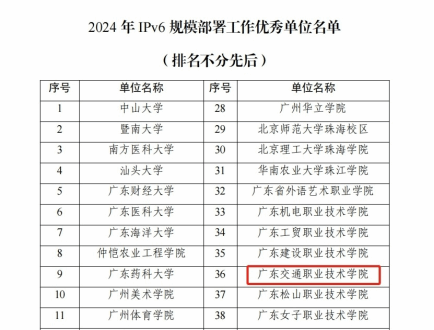 近日,广东省教育厅发布了《广东省教育厅关于对2024年高校IPv6规模部署推进工作成效明显单位予以表扬的通报》,我院以优异的成绩荣获“2024年IPv6规模部署工作优秀单位”称号。