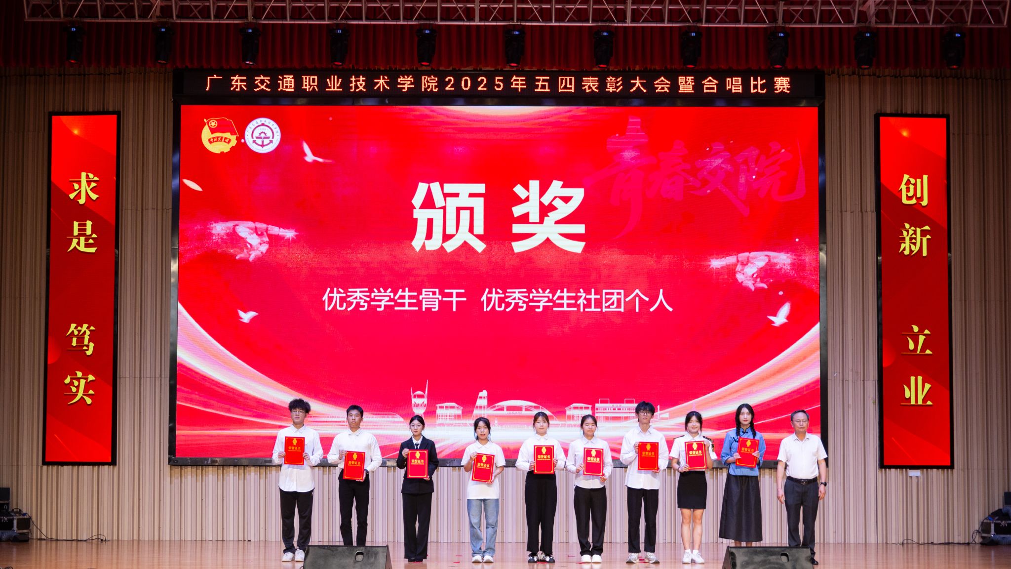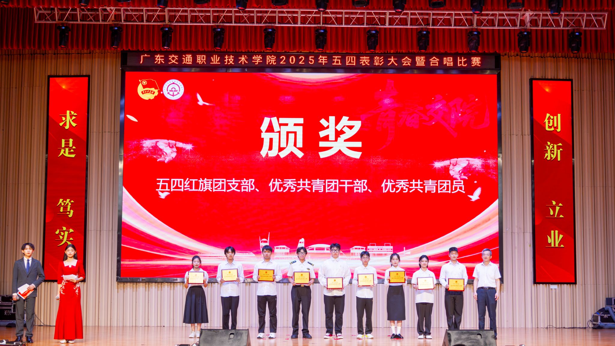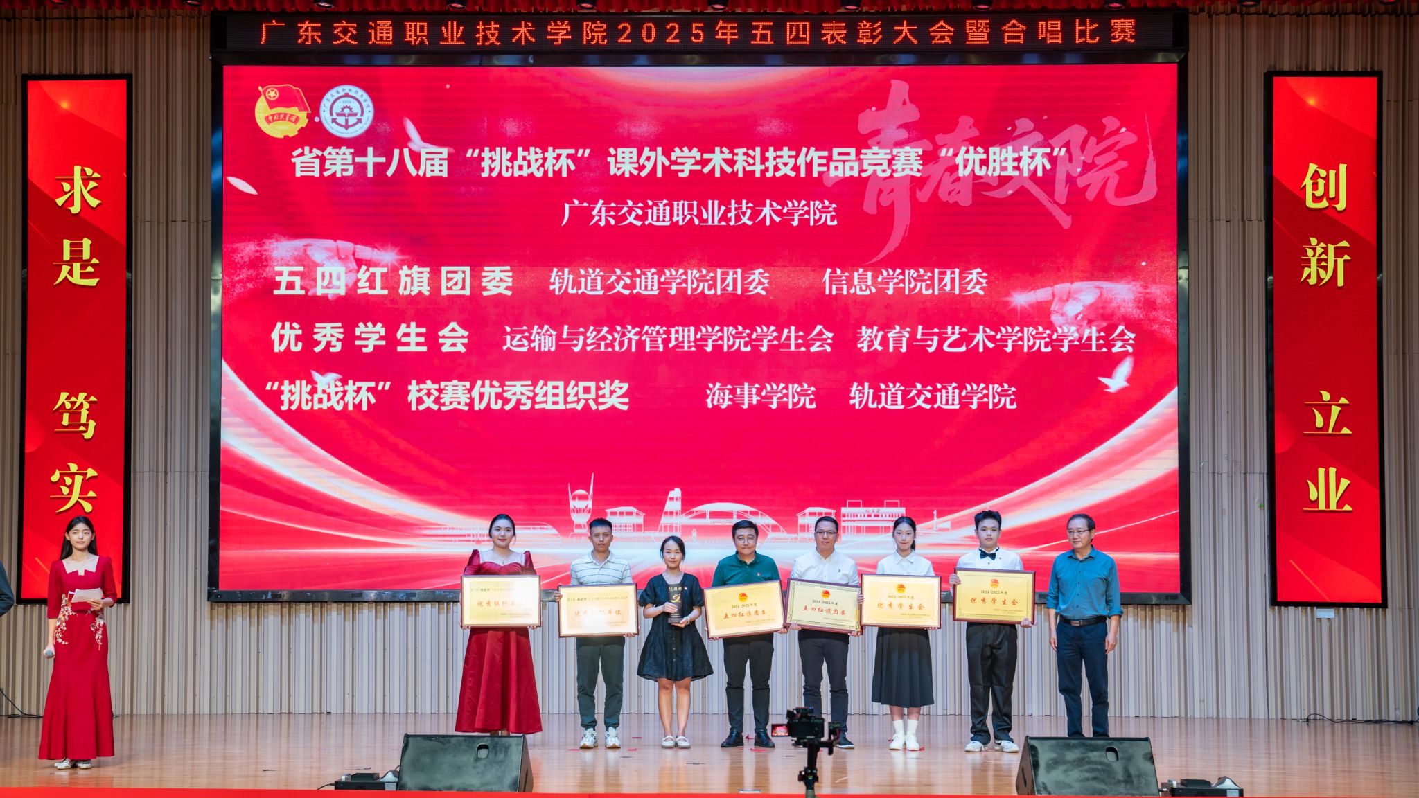 廖金宝宣读了学院《关于表彰2024-2025年度先进集体和先进个人的决定》,勉励各级团组织、团干部和团员青年以受表彰的先进典型为榜样,自觉以实现中华民族伟大复兴为己任,为中国式现代化建设贡献青春力量。大会授予轨道交通学院团委、信息学院团委“五四红旗团委”称号,授予运输与经济管理学院学生会、教育与艺术学院学生会“优秀学生会”称号,授予2023级道路与桥梁工程技术1班团支部等30个基层团支部“五四红旗团支部”称号,授予刘炜杰等307名同学“优秀共青团员”称号,授予朱键等3名教师、王嘉怡等97名同学“优秀共青团干部”称号,授予卢思盈等289位同学“优秀学生骨干”称号,授予马舒欣等92位同学“优秀社团个人”称号。与会领导嘉宾依次为获奖代表颁奖。大会还表彰了广东省“百千万工程”突击队行动优秀典型案例、广东省“多彩乡村 共谱新篇”系列实践活动获奖代表、最美志愿者、“挑战杯”获奖作品等奖项。