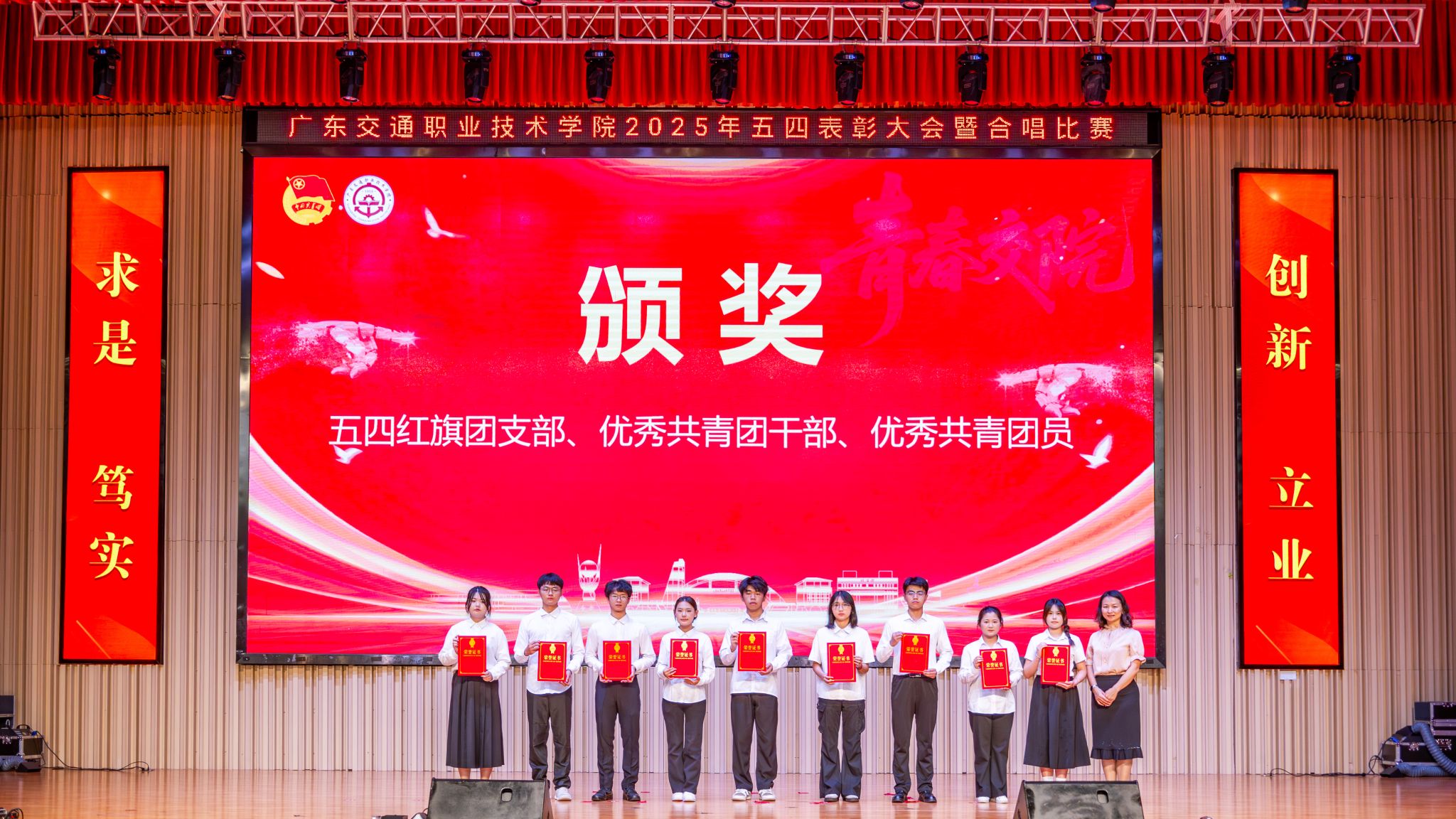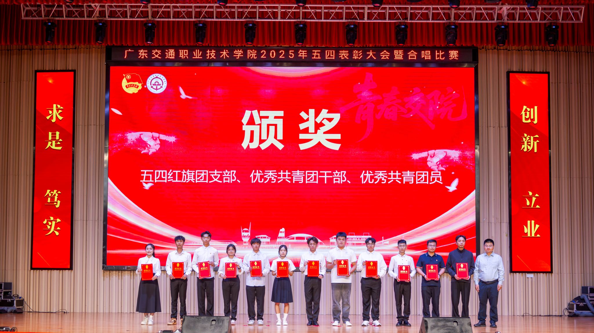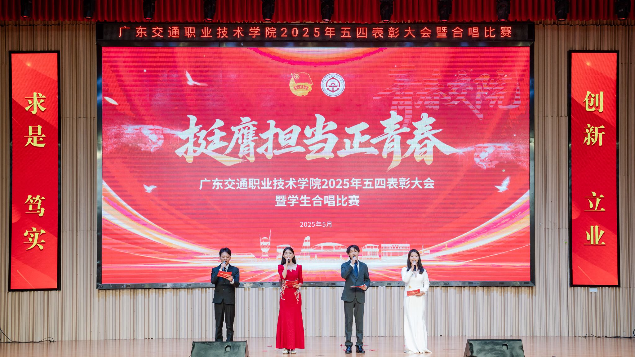 为深入贯彻习近平总书记关于青年工作的重要思想,激励新时代青年在中国式现代化建设中挺膺担当,厚植爱党爱国爱校情怀,展现广交青年青春风采,5月22日下午,学院在清远校区多功能厅举行2025年五四表彰大会暨“广交之声 唱响未来”合唱比赛。学院党委副书记、院长罗毅,党委副书记、纪委书记蔡艺,党委副书记廖金宝,副院长熊嘉逸、邱文祥,各职能部门负责人,二级学院党委书记、副书记、师生代表出席大会。大会邀请广东岭南职业技术学院美育中心主任蒙园,广东财贸职业技术学院美育教研室主任邓小宇,佛山市流行音乐协会主席团成员、星众流行合唱团艺术指导林琳,佛山市流行音乐协会理事、广东省音乐家协会会员曾子灵担任合唱比赛评委。大会通过“广交青年”视频号实时直播。