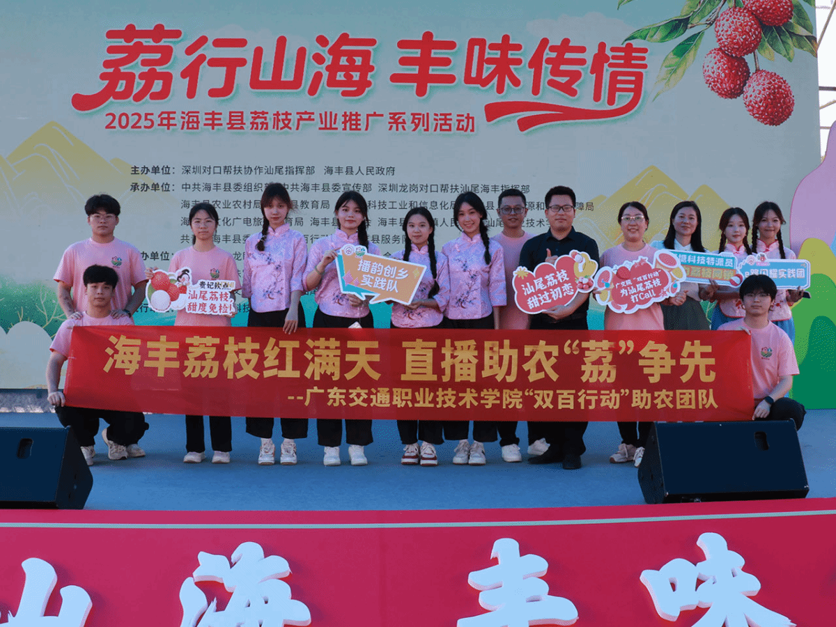 7月3日,深圳对口帮扶协作汕尾指挥部、海丰县人民政府联合举办的“荔行山海·丰味传情”2025年荔枝产业推广系列活动在汕尾市海丰县上达村举行。运输与经济管理学院“播韵创乡”和“e路闪耀”三下乡实践团组成的“双百行动”助农团队受邀参与,并参与了现场直播带货的环节。
