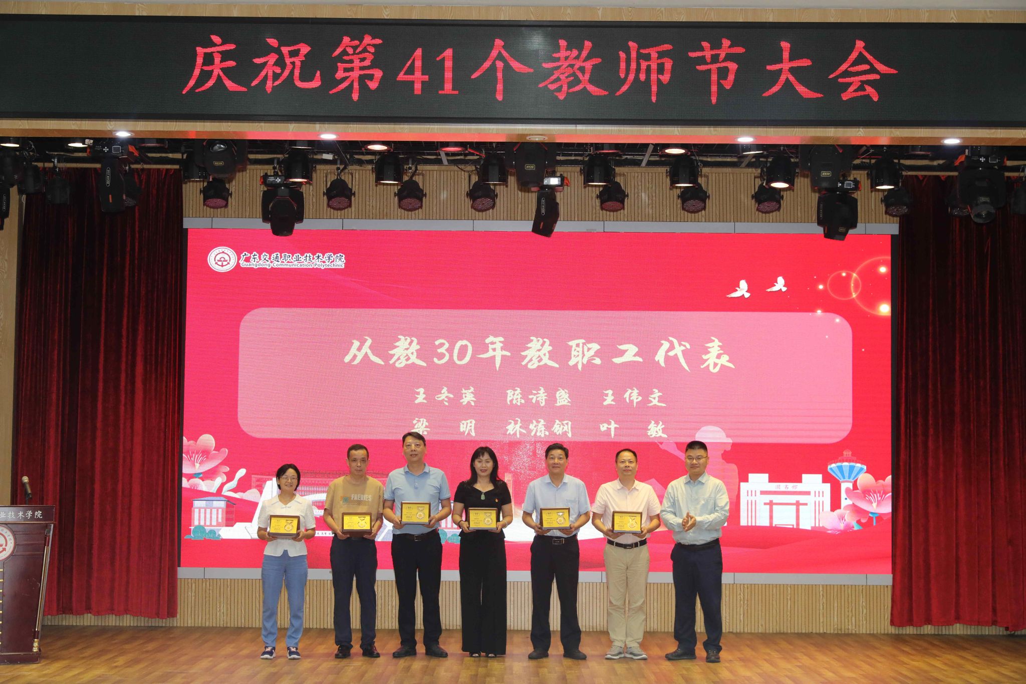 随后举行的教师荣休仪式和从教30年表彰仪式将大会气氛推向高潮。学院领导为杨志伟、朱东华等荣休教师代表颁发荣誉证书,为梁明、王冬英等从教30年的教职工代表颁发纪念品,致敬他们数十载如一日的坚守与奉献。杨志伟寄语青年教师不忘教育初心,传承师者精神。荣休教师为新进教师佩戴校徽,将“新时代交通精神”“铺路石品格 航标灯精神”的广交职院价值观传承至新进教师。新进教师代表庄严宣誓,铿锵誓言展现了新一代广交职院教师投身教育事业的坚定决心。