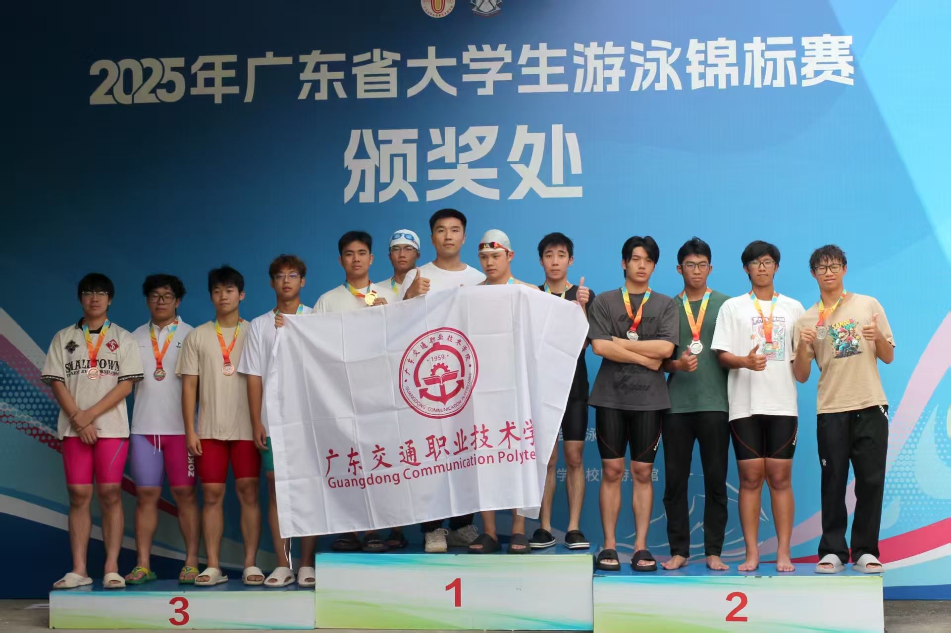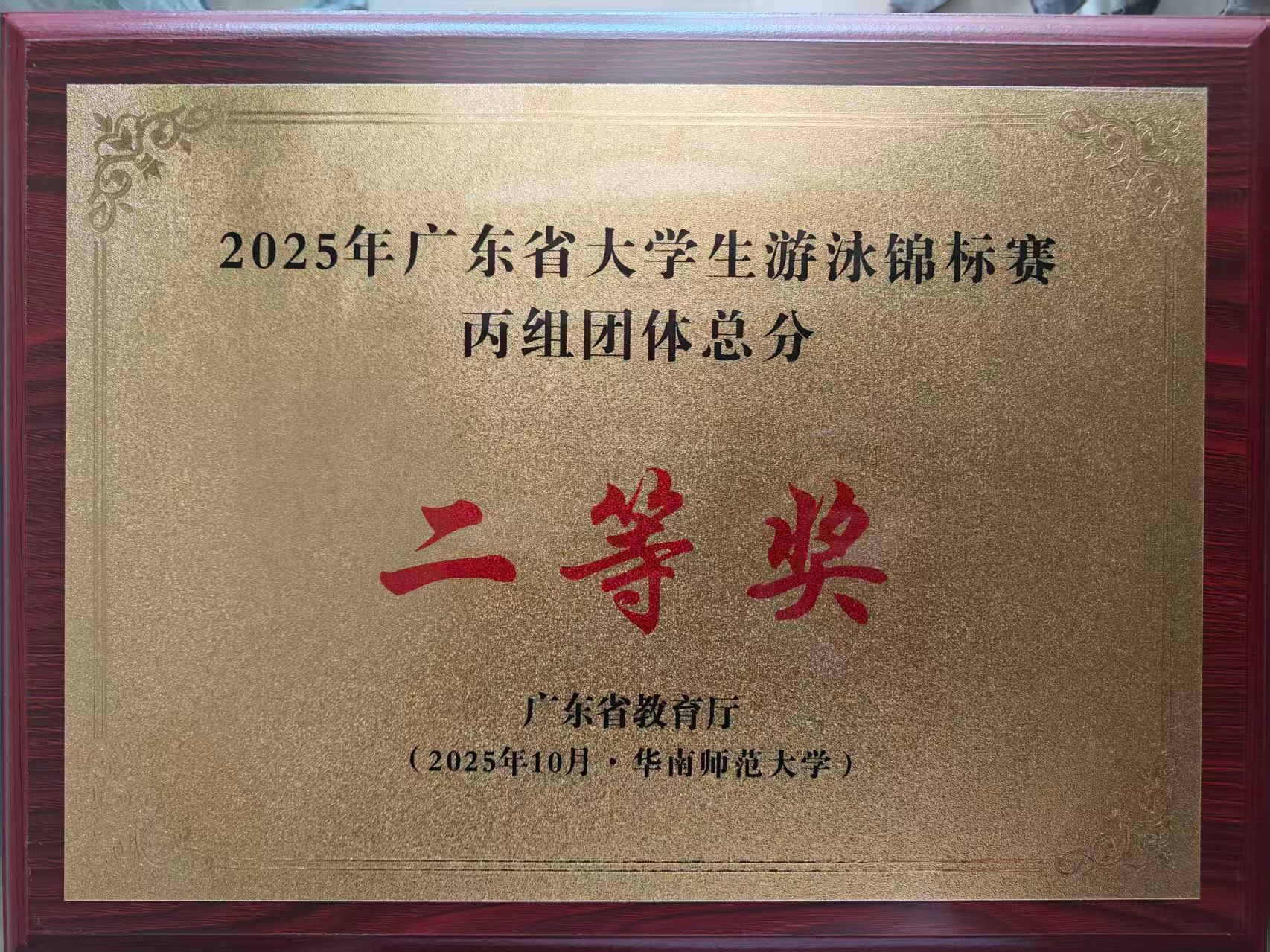 10月13日,由广东省教育厅主办的2025年广东省大学生游泳锦标赛在华南师范大学游泳馆顺利闭幕。由我院组建的代表队在比赛中发挥出色,荣获男子丙组4×50米混合泳接力冠军、男子丙组50米仰泳冠军、男子丙组50米自由泳季军等多项佳绩,并夺得团体总分二等奖,展现出良好的竞技状态与团队风貌。