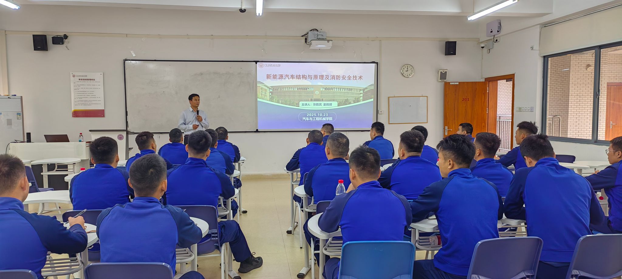 为进一步深化校地合作,充分利用学院专业资源支持地方专业队伍建设,共同筑牢公共安全防线,10月23日,在党委保卫部、安全保卫处统筹协调下,汽车与工程机械学院副院长张胜宾副教授为清远市清城区消防救援大队举办了一场题为《新能源汽车结构与原理及消防安全技术》的专题讲座。清远市清城区消防救援大队大队长周亚东以及大队技术骨干到场聆听学习。