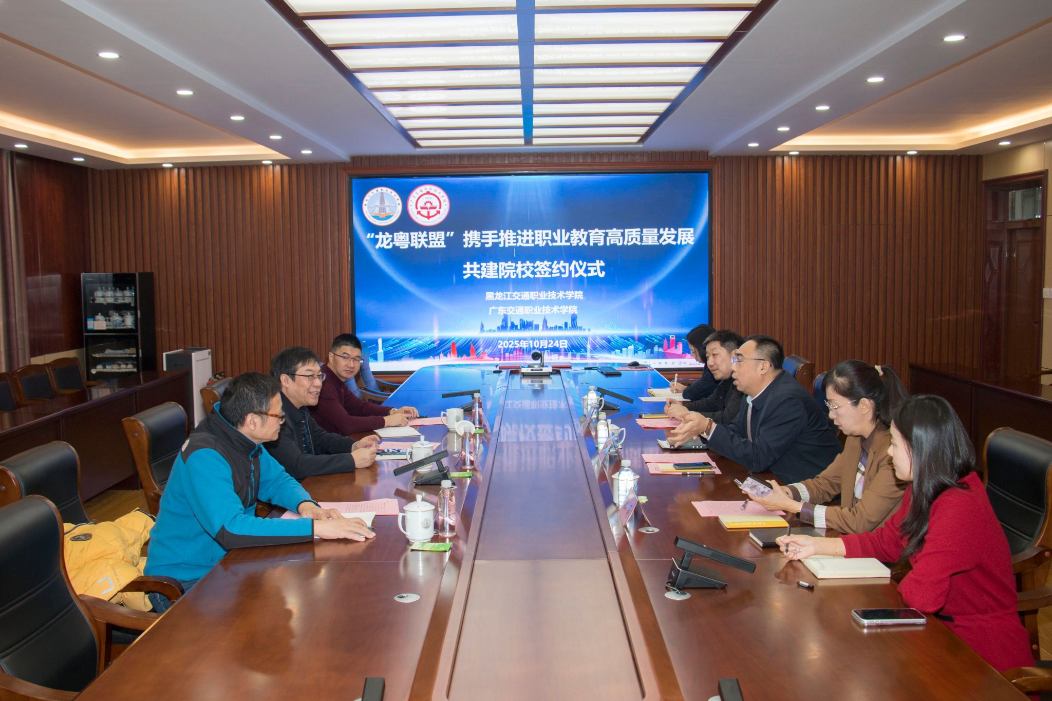 10月24日,王劲松带队前往黑龙江交职院开展合作交流,并举行师资队伍共建签约仪式。黑龙江交通职业技术学院党委副书记高汉峰、副校长刘万昱,两校党政办公室、人事部门相关负责人参加座谈交流会。