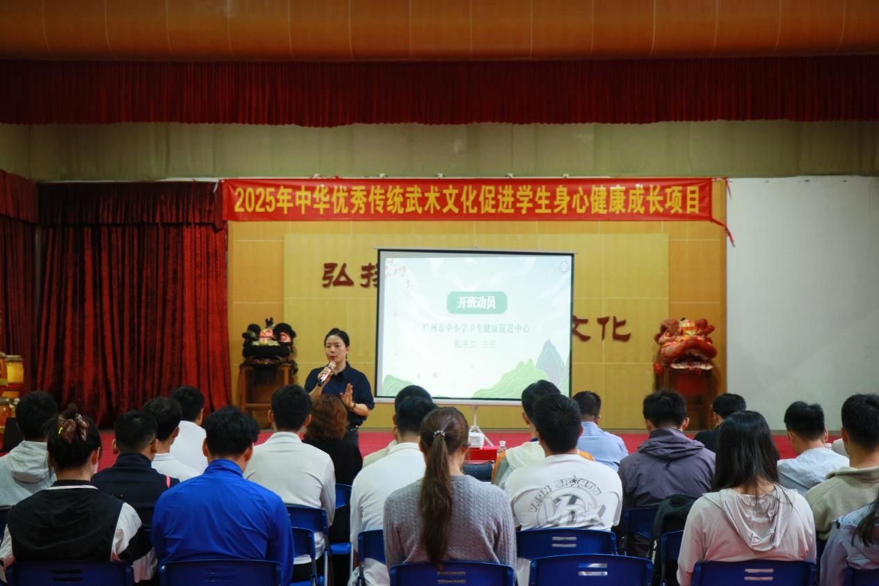 仪式上,禅武国际联盟(匈牙利)广东办事处主任高菲介绍了项目内容。该项目以“禅武文化”为核心,课程涵盖传统功夫礼仪、基本功、南粤功夫操、功夫扇、太极八式以及体育与健康科普讲座等多个方面。我院继续教育学院院长陈少烽表示,学院将依托“一院三基地”的平台优势,为项目实施提供全面支持。广州市中小学卫生健康促进中心主任戴秀文在动员讲话中强调,优秀传统文化与武术教育对促进青少年身心健康具有重要作用,鼓励教师们将传统文化精髓与武术精神融入教学实践。